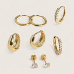 • Complete Set: 8 pieces—4 mm CZ studs, 10 mm slim hoops, 10 mm pavé huggies, and 5 mm chunky mini hoops