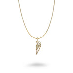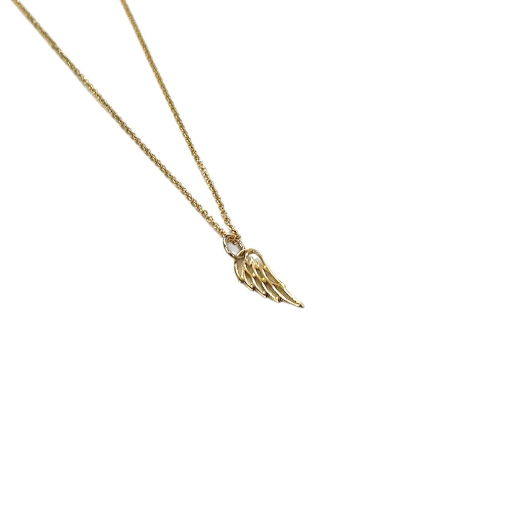 Elevate your spirit with our angelic 40-micron gold-plated sterling silver angel wing pendant, measuring a graceful 18mm in height and 6mm in width. Paired elegantly with a 14kt gold-plated 18" chain, this pendant embodies both elegance and a celestial connection. The angel wing, a symbol of guidance and protection, adorns your neckline with its intricate design. The substantial gold plating ensures a lasting radiance, in perfect harmony with the golden shimmer of the chain. Whether worn as a source of comfort or a statement of personal belief, this pendant and chain combination exudes both spiritual significance and enduring style, making it a cherished addition to your jewelry collection.