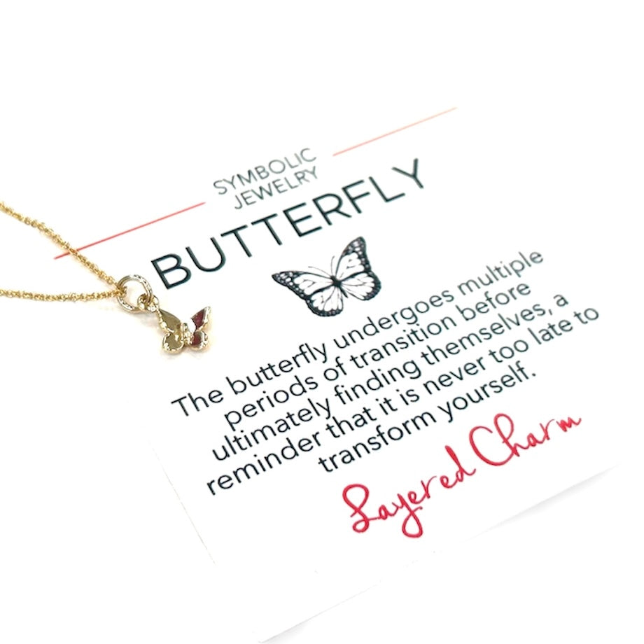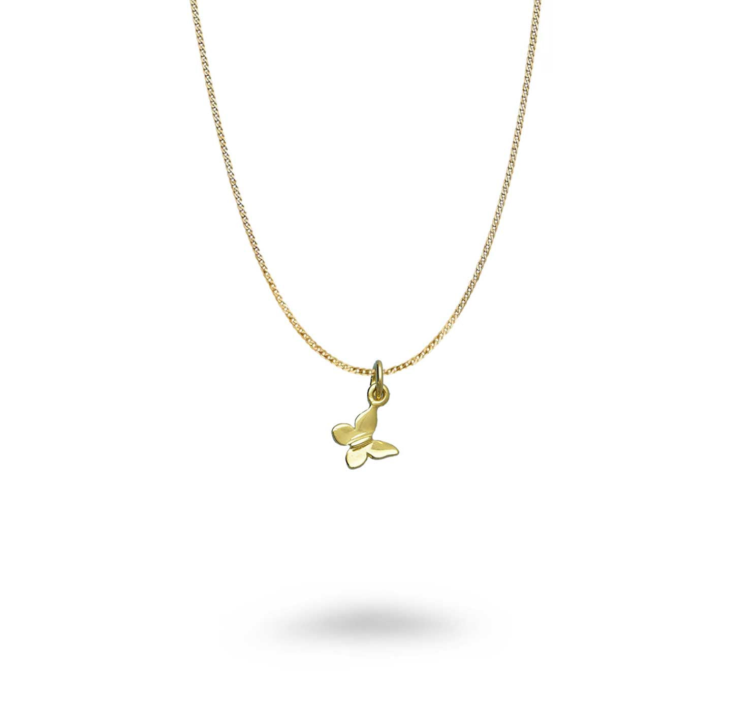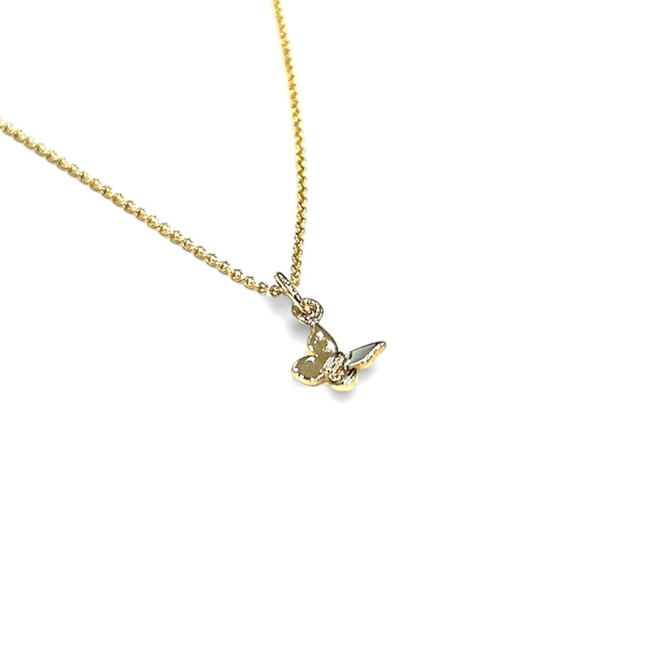 Embrace the delicate beauty of nature with our 40-micron gold-plated sterling silver tiny butterfly pendant, a petite masterpiece standing 12mm tall and 10mm wide. Paired gracefully with a 14kt gold-filled 18" chain, this pendant exudes elegance and charm. The butterfly, a symbol of transformation and grace, graces your neckline with its intricate design. The substantial gold plating ensures lasting radiance, harmonizing with the shimmer of the gold-filled chain. Whether worn as a personal talisman or gifted to a loved one, this pendant and chain combination celebrates both the intricacies of nature and the transformative power of style, becoming an endearing addition to your jewelry collection.