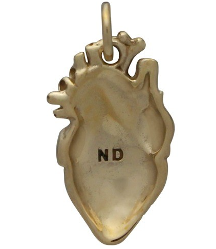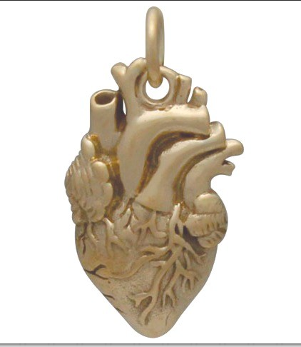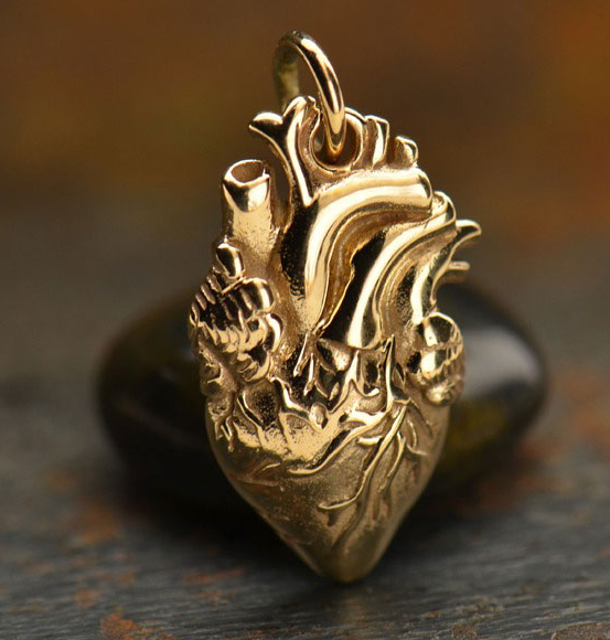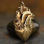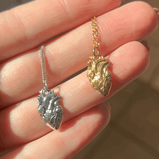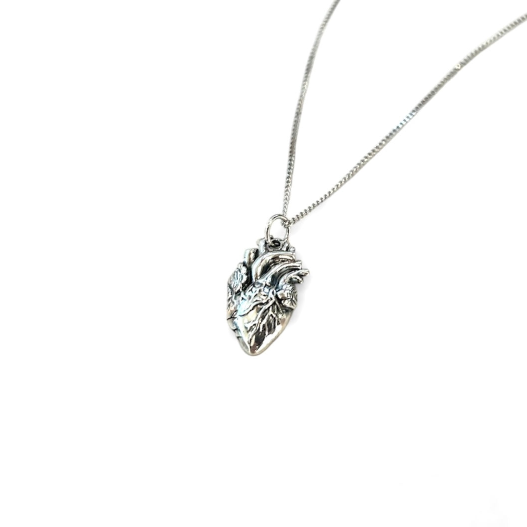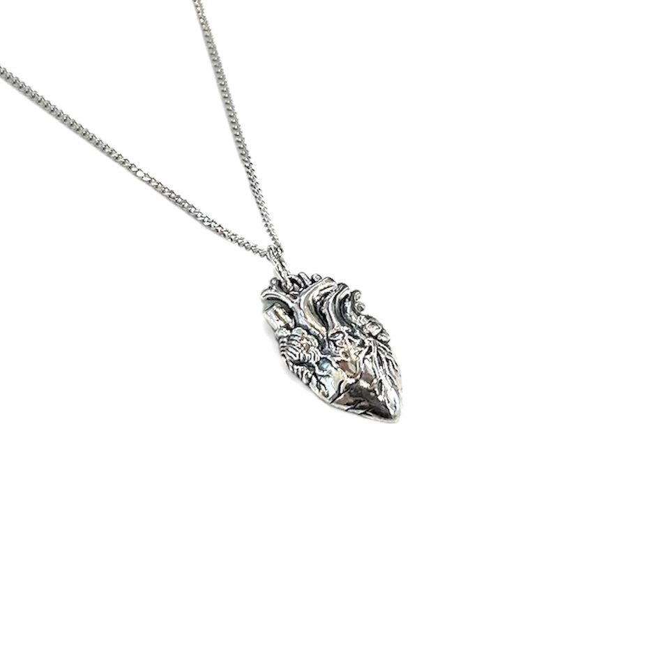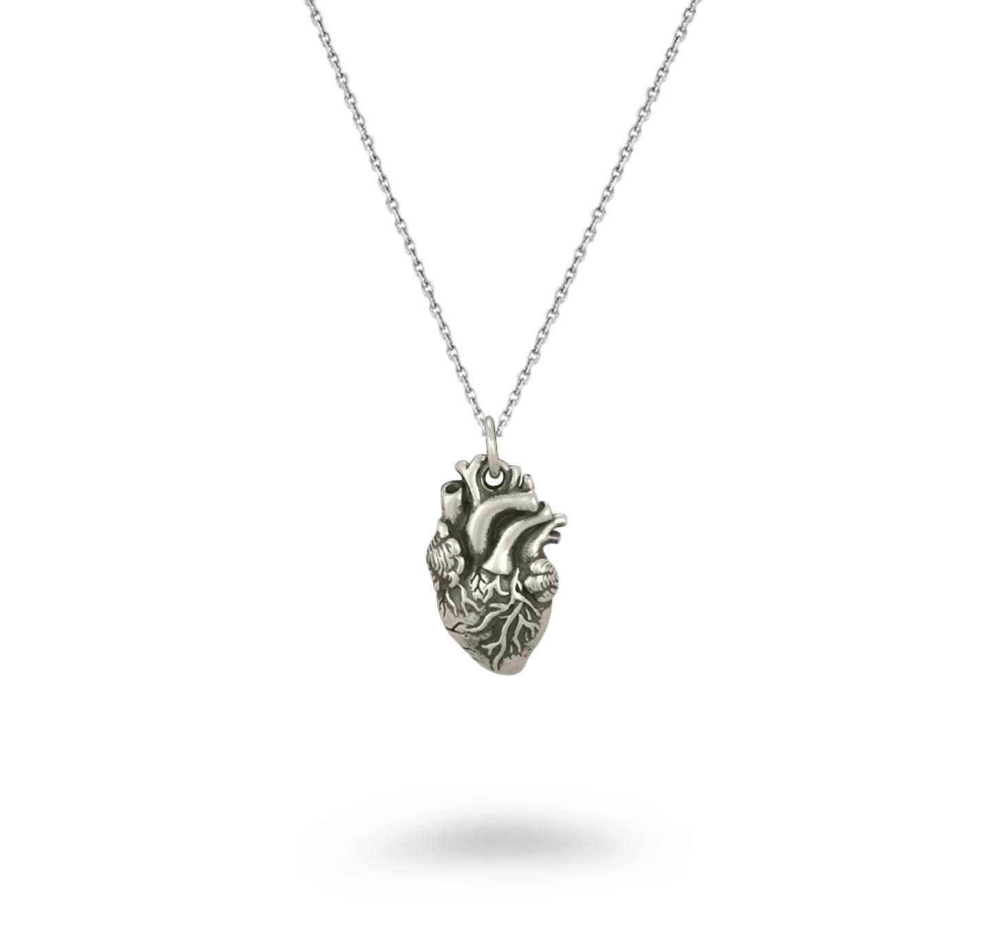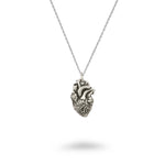 Make a statement with this Anatomical Heart necklace with chambers and arteries. This pendant is made of silver and is paired with a rhodium sterling silver chain or bronze pendant is paired with a black rhodium sterling silver chain. The size of the pendant is 21mm tall by 10mm wide.