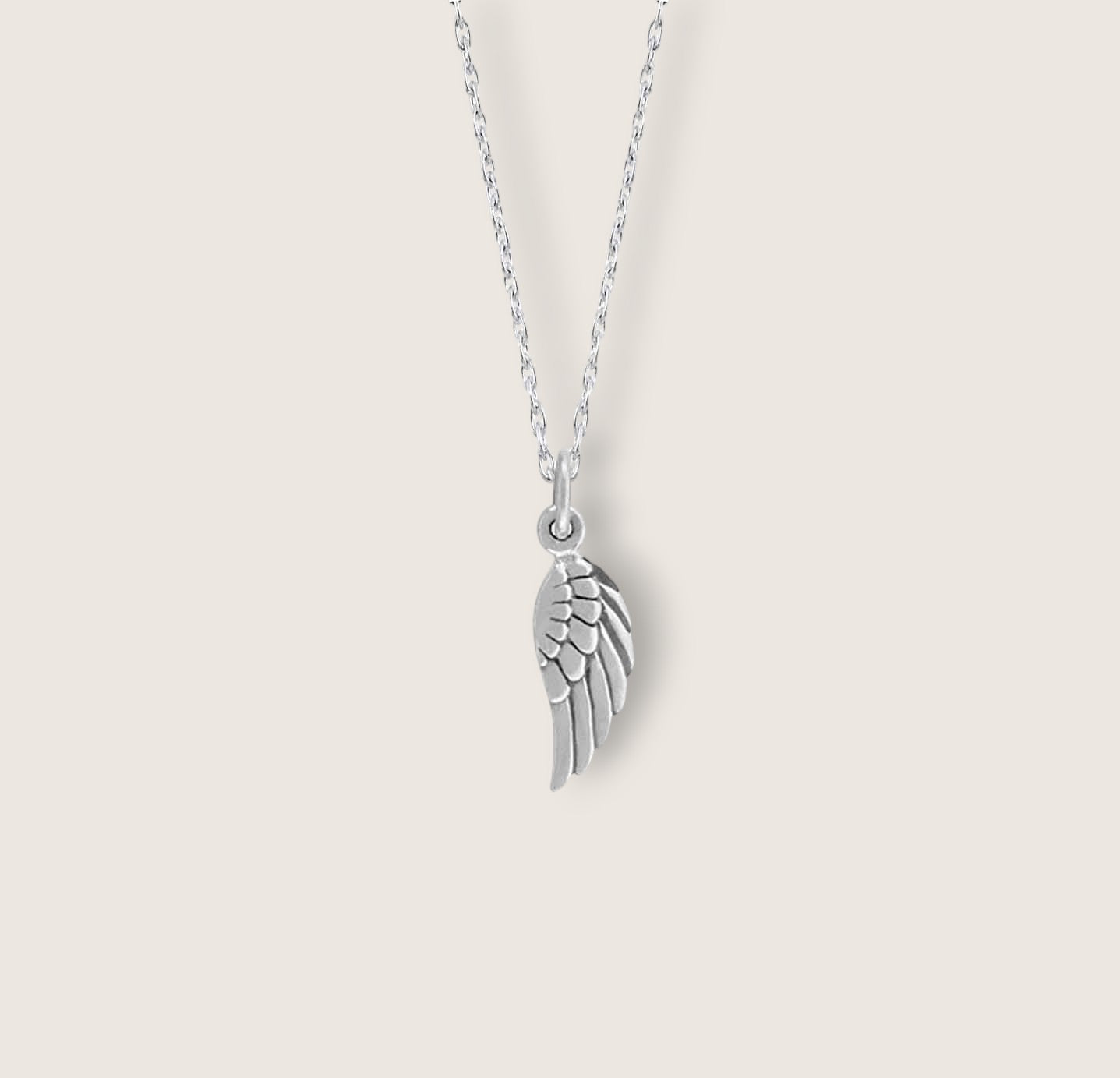 This sterling silver angel wing is paired with a sterling silver chain.