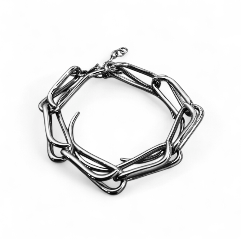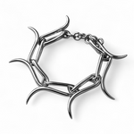 Tame the wild current. The Arc Fang Bracelet fuses polished stainless steel spikes into a flexible, chaotic chain of energy. Designed to be worn spikes-out for maximum impact or spikes-in for a sleeker look, it's a brutalist twist on the classic chain bracelet. Adjustable for a customized fit, this piece is made for those who live untethered and electrified.