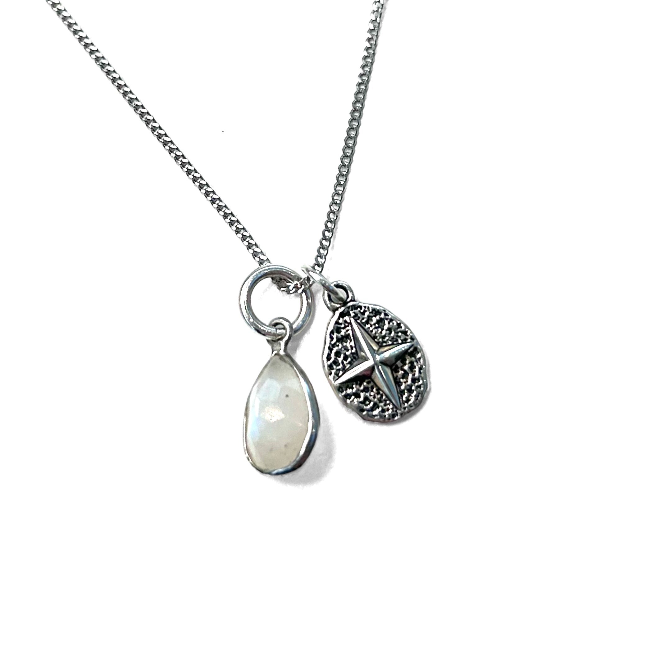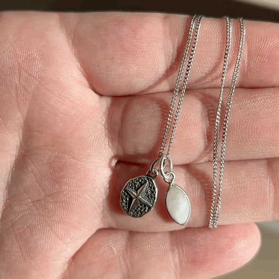 This beautifully crafted star coin pendant measures 17mm tall by 9mm wide and is paired with a sterling silver chain.