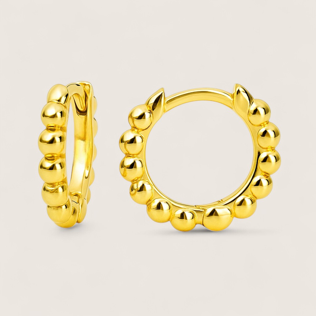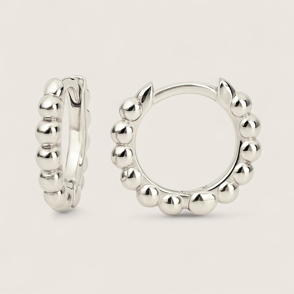 These chic 11mm beaded hoop huggies bring a modern twist to a timeless silhouette. Crafted in sterling silver and finished with your choice of luxurious 18K gold plating or sleek rhodium plating, each earring features a playful row of rounded beads that catch the light from every angle. With a 1.5mm thickness, they strike the perfect balance between delicate and bold, making them an effortless everyday staple or a stylish stackable piece.