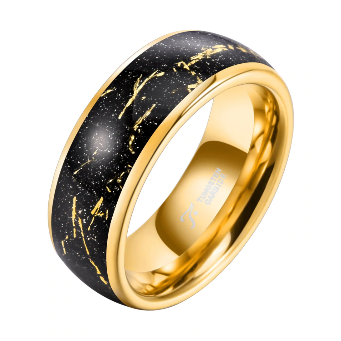 This is one very uniquely designed tungsten ring. It resembles a meteor shower with the flicks of gold on the middle of the band like flying meteors through the black center like the night sky. Tungsten rings are known for their hardness they don't scratch like silver or gold rings making them one of the most durable low-maintenance ring options on the market. Keep in mind this ring is triple gold plated to ensure longer plating life.  This ring is 8mm wide and has a comfort-fit inner radius for a more comfortable fit.