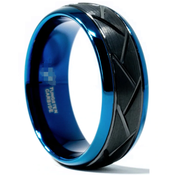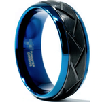 Make a statement with this black crosshatch center pattern tiered with blue edges tungsten ring. This ring is 8mm wide and has a comfort-fit inner radius for a more comfortable fit.