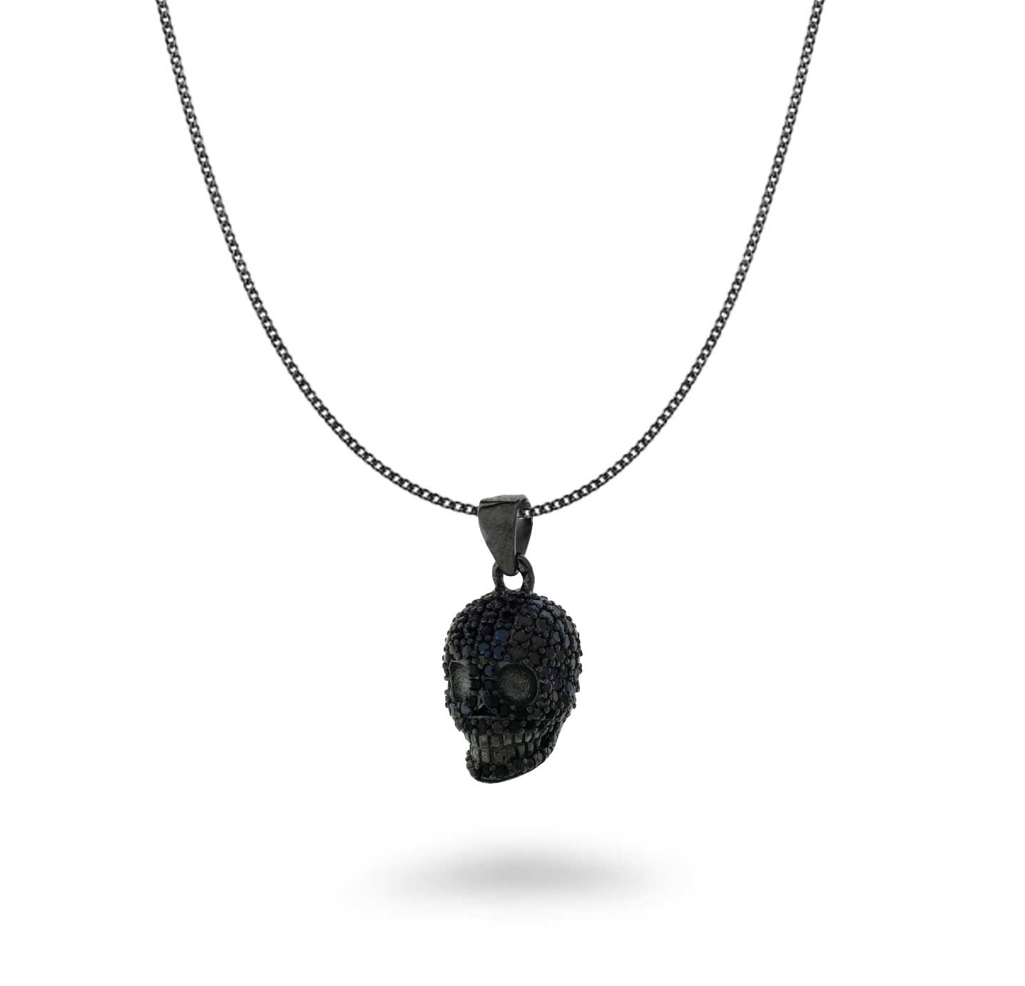 Embrace the edgy allure with our Sterling Silver Black Rhodium-Plated Skull Pendant, measuring 19mm in height and 9.5mm in width, coupled with an 18-inch black rhodium-plated sterling silver chain. This pendant makes a bold statement, featuring a meticulously designed skull encrusted with striking black cubic zirconia stones. The black rhodium plating adds a touch of drama to the ensemble, enhancing the pendant's daring appeal. Whether for an evening out or as a distinctive addition to your everyday style, this pendant effortlessly combines individuality and timeless craftsmanship. Explore your bold side with this intriguing and captivating piece, perfect for those with a taste for the extraordinary.