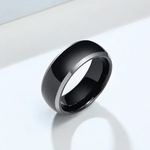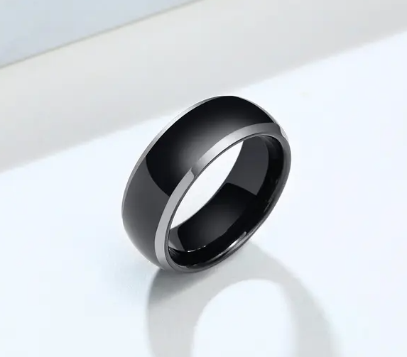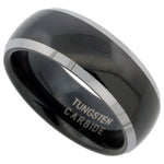This 8mm black tungsten wedding ring features two-tone beveled edges and a comfortable fit. The strength of tungsten matched with the comfort-fit inlay, making it more enjoyable and easy to wear. The design of the tungsten is a beveled top pattern with polished two-tone sides.  If you are allergic to most metals, this is a great option, and this ring is also nickel-free.