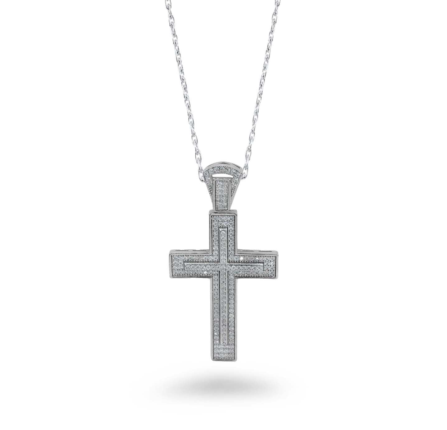 Paired with an 18" chain, this necklace adds a touch of glamour to any ensemble. The rhodium or gold plating not only enhances the aesthetic appeal but also ensures durability and lasting shine. The meticulous craftsmanship of the bling CZ cross pendant creates a piece that seamlessly blends contemporary style with a timeless symbol.