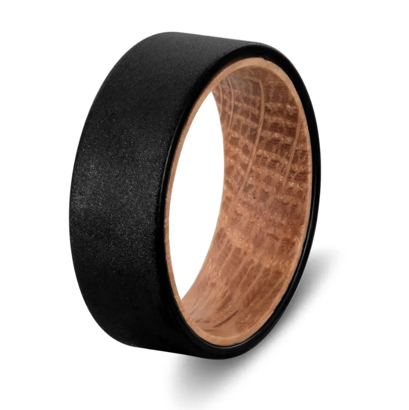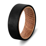 Enjoy this unique combination ring: the strength of tungsten matched with the warmth and natural feeling of wood in the inlay. This ring features a unique barrel wood inlay. The design of the tungsten is a brushed beveled top pattern with polished sides slightly exposes the wood inlay from the side angle. If you are allergic to most metals, this is a great option, and this ring is also nickel-free. The ring is 8mm wide and has a wood comfort-fit inlay, making it more enjoyable and easy to wear.