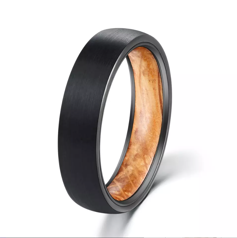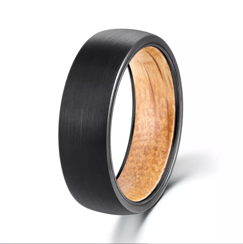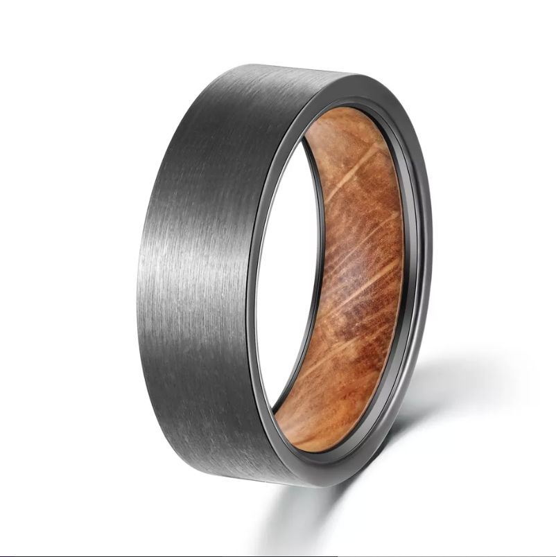 Enjoy this unique combination ring: the strength of tungsten matched with the warmth and natural feeling of wood in the inlay. This ring features a unique whiskey oak barrel wood inlay. The design of the tungsten is a brushed top pattern. If you are allergic to most metals, this is a great option, and this ring is also nickel-free. The ring is 5.5mm or 7mm wide and has a wood comfort-fit inlay, making it more enjoyable and easy to wear.