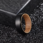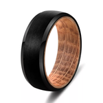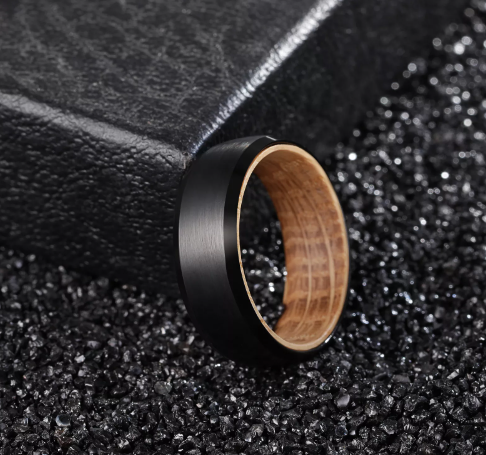 Enjoy this unique combination ring: the strength of tungsten matched with the warmth and natural feeling of wood in the inlay. This ring features a unique barrel wood inlay. The design of the tungsten is a brushed beveled pattern with polished sides slightly exposes the wood inlay from the side angle. If you are allergic to most metals, this is a great option, and this ring is also nickel-free. The ring is 8mm wide and has a wood comfort-fit inlay, making it more enjoyable and easy to wear.