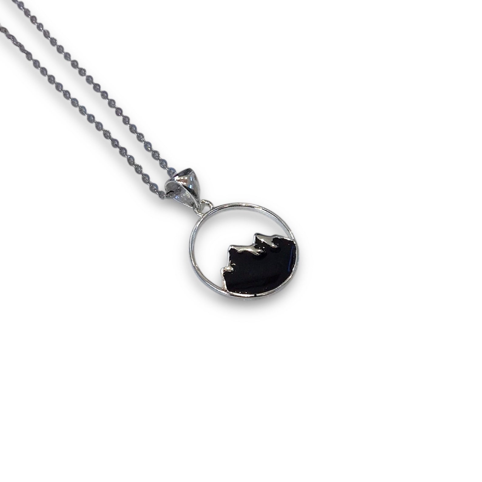 Do you love the mountains? With the fresh mountain air and the majestic beauty of being in the mountains, this necklace will remind you of your treks through them. This necklace is sterling silver with an oxidized mountain range within a circle design.