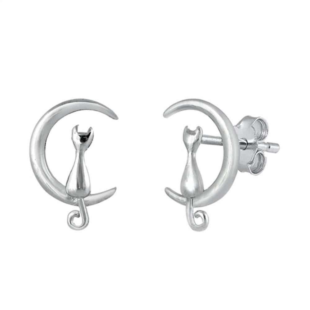 Sterling Silver Rhodium Plated Cat on Moon Small Stud Earrings