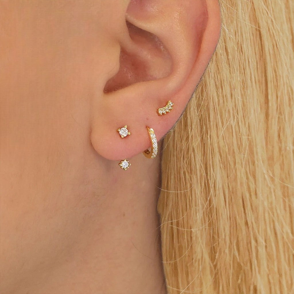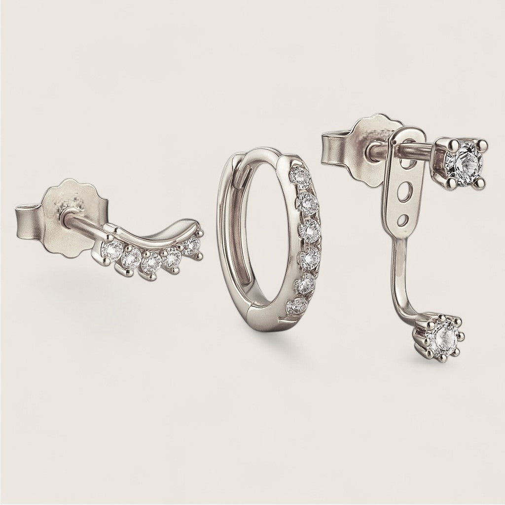 Shine in every direction with the Celestial Arc Earring Set, a trio of designs that capture the brilliance of starlight. Featuring a sparkling CZ-studded hoop, a delicate stud with an adjustable jacket, and an elegant CZ climber, this set allows for endless styling combinations.