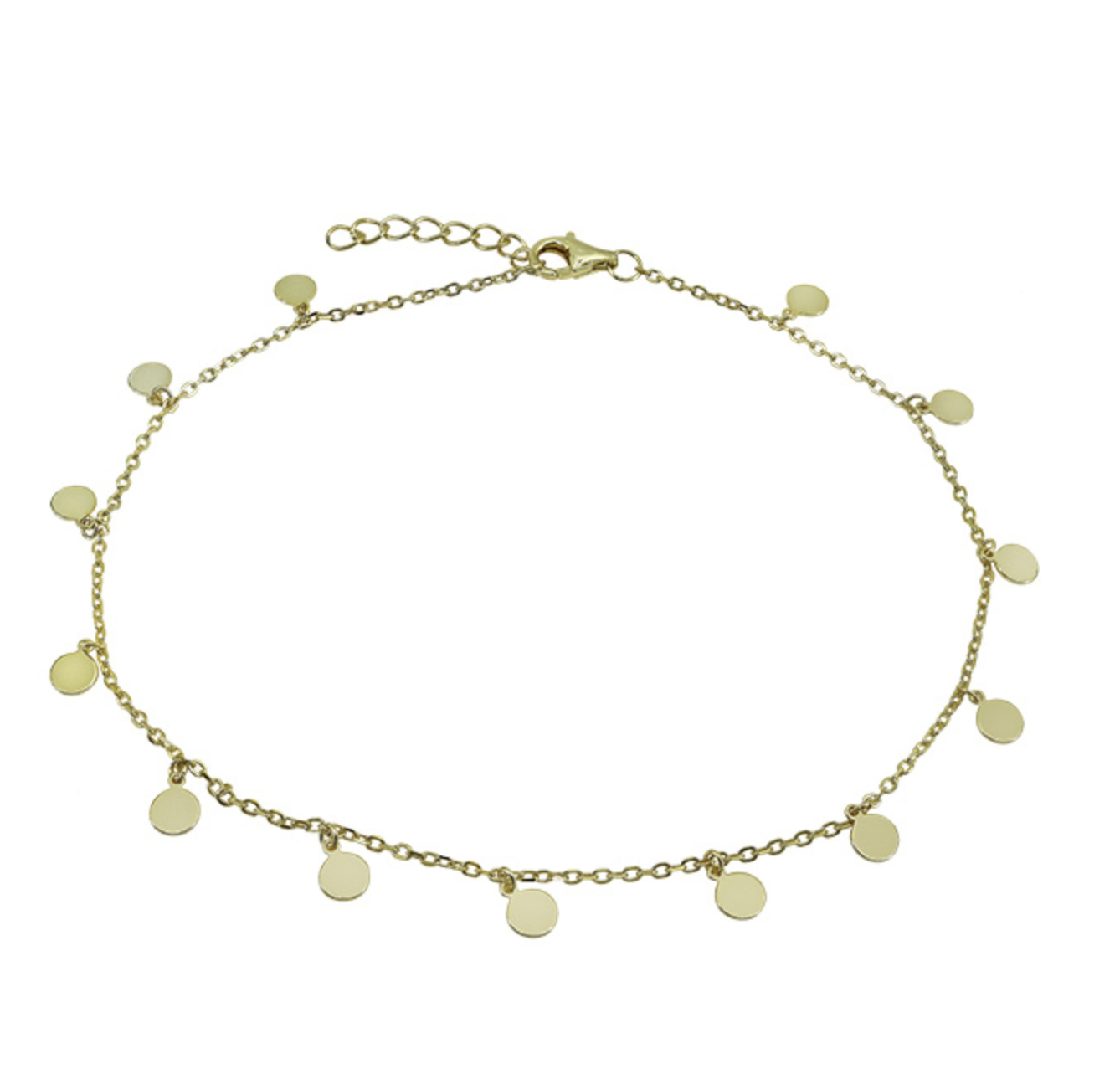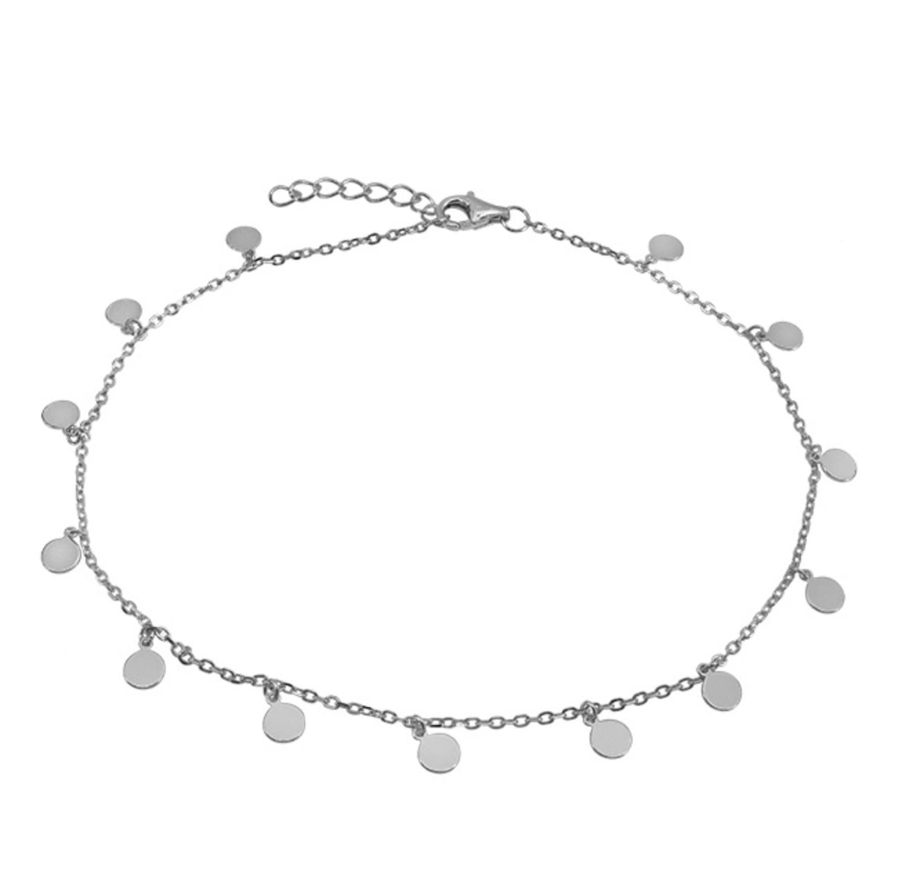 This eye-catching anklet has been crafted with sterling silver and gold and is adorned with flat rounds. Sterling silver with rhodium, 4mm flat round disc anklet, 9″ + 1″ extension