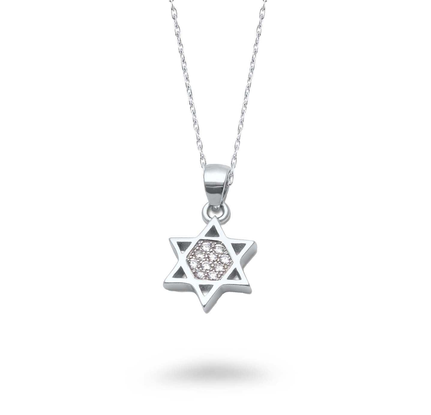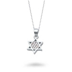 Sterling Silver Blue Sapphire or clear CZ center Star of David Pendant paired on a sterling silver chain.