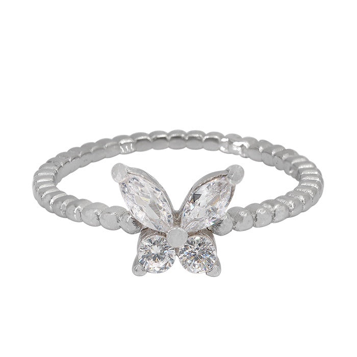 Sterling silver with rhodium, 7x9mm butterfly ring with cubic zirconia, 1.5mm beaded band