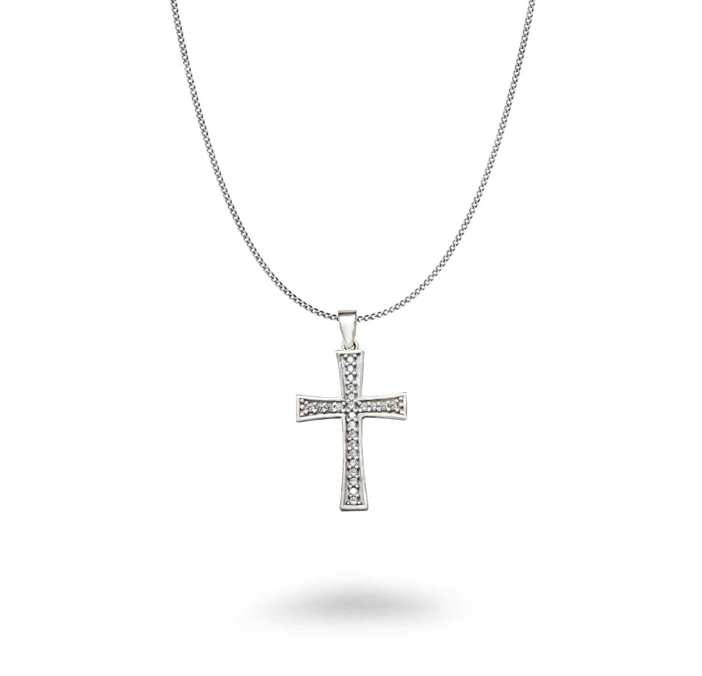 Embrace faith and elegance with our sterling silver cross pendant necklace. Delicately designed, this timeless piece features a cross adorned with sparkling CZs along its center, adding a touch of brilliance and grace. Suspended on a sterling silver chain, this necklace beautifully captures the essence of devotion and style, making it a cherished symbol of your beliefs and a stunning accessory for any occasion.
