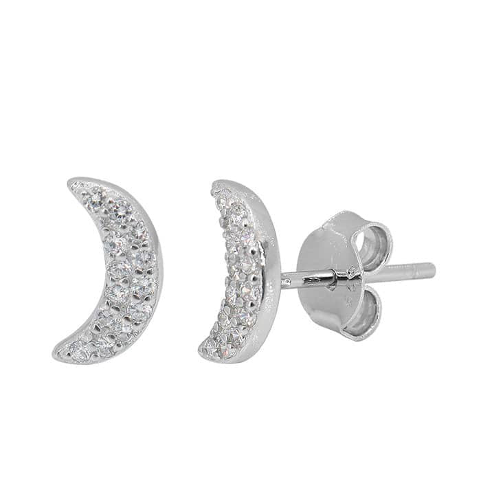 Sterling silver with rhodium, 5×8.5mm crescent moon stud earrings with cubic zirconia