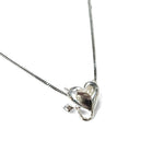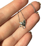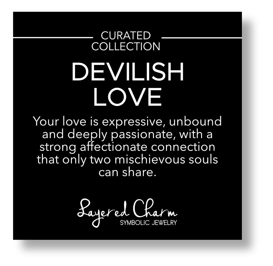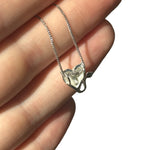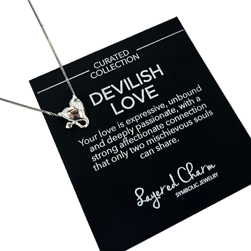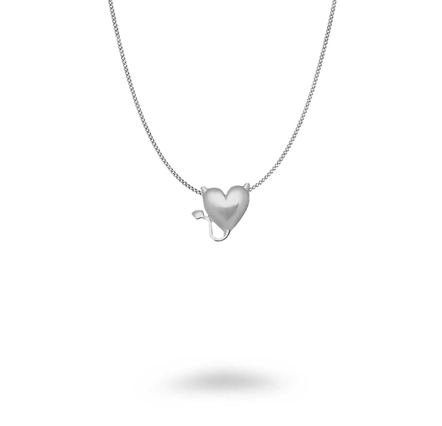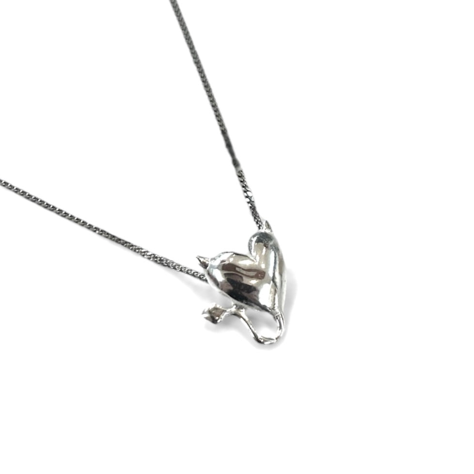 This smooth sterling silver devil horned heart with tail slider pendant is 12mm wide and tall and paired on a 18" sterling silver rhodium plated chain.