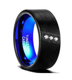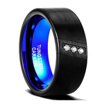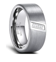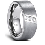 Enjoy this beautifully crafted flat profile tungsten ring with three CZ's on an angle in the center of the ring. Tungsten rings are known for their hardness they don't scratch like silver or gold rings making them one of the most durable low-maintenance ring options on the market.This ring is 8mm wide and has a comfort-fit inner radius for a more comfortable fit.