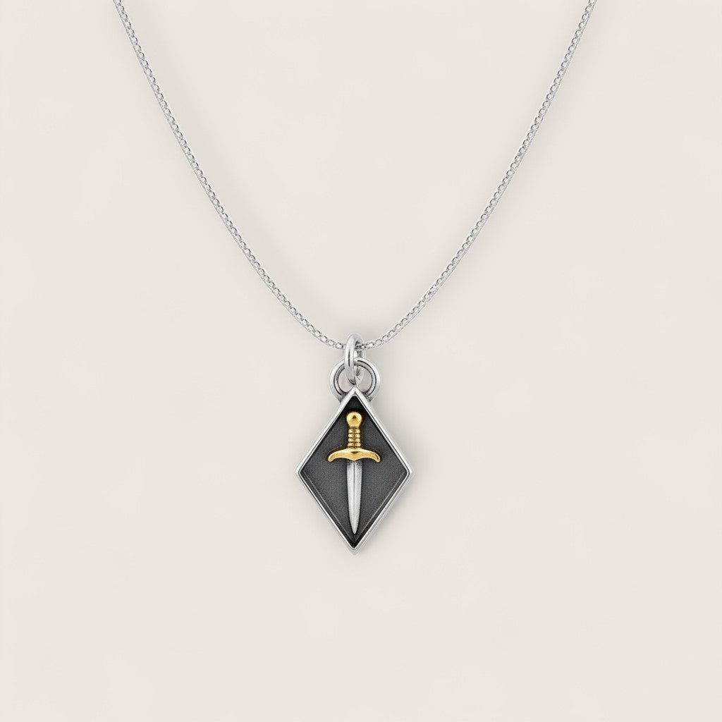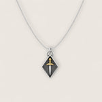 Introducing our Mixed Metal Diamond-Shaped Pendant Necklace, a striking blend of bronze and sterling silver craftsmanship. The pendant features a unique bronze sword design set within a sterling silver shadow box frame, creating a captivating contrast of materials and textures. With dimensions of 21x10mm, the pendant exudes a sleek and modern elegance. Paired with an 18-inch sterling silver rhodium-plated chain, this necklace offers both durability and timeless shine. Whether worn as a statement piece or layered with other necklaces for a personalized look, this pendant adds a touch of bold sophistication to any ensemble. Embrace the fusion of mixed metals and elevate your style with this exquisite necklace.