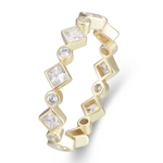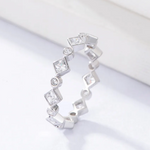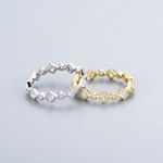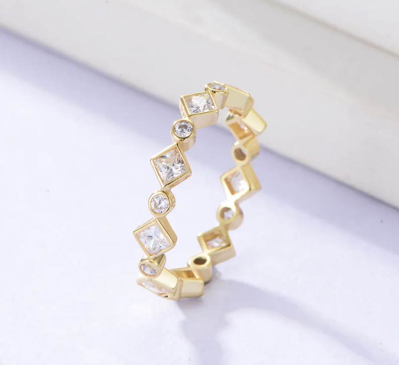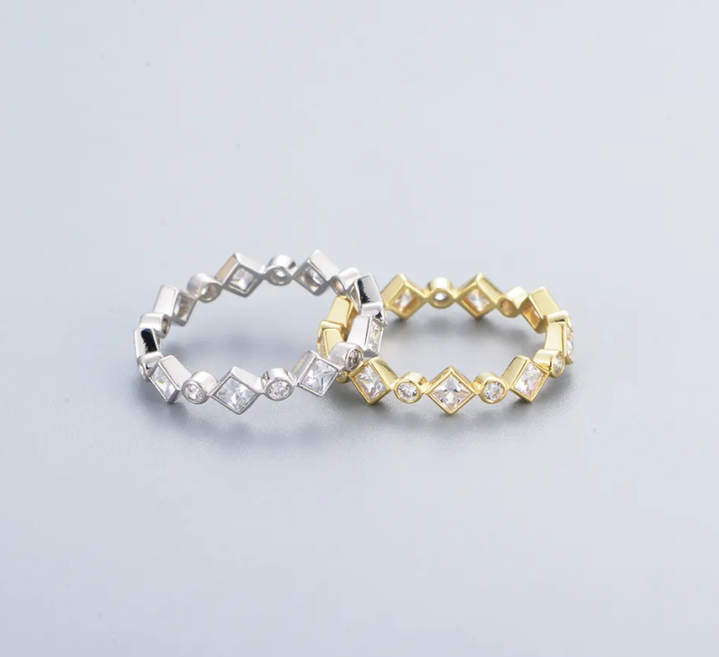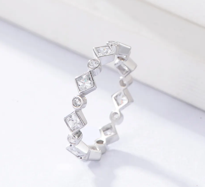 Enjoy this elegant modern 925 sterling silver eternity ring. Classic with a modern take makes it easy to wear and stack with other rings too. CZ's are a bezel set setting.