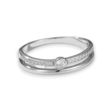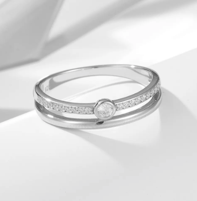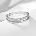 Introducing the Double Layered Band Sterling Silver Ring from Layered Charm, a perfect blend of elegance and modern design. This exquisite ring features two distinct bands: one adorned with a central solitaire bezel-set cubic zirconia (CZ) surrounded by small embedded CZ stones along the band, and the other showcasing a smooth beveled finish.