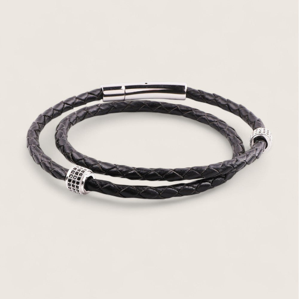 Crafted from genuine braided leather and accented with CZ-studded charms, this double-wrap design pairs modern texture with lasting meaning. The sleek stainless-steel magnetic clasp ensures effortless wear, while the shimmer of CZ adds a hint of refined brilliance.