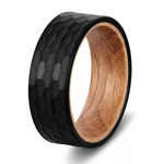 Enjoy this unique combination ring: the strength of tungsten matched with the warmth and natural feeling of wood in the inlay. This ring features a unique barrel wood inlay. The design of the tungsten is a hammered brushed pattern that glimmers on the faceted while slightly exposes the wood inlay from the side angle. If you are allergic to most metals this is a great option, and this ring is also nickel-free. The ring is 8mm wide and has a wood comfort-fit inlay, making it more enjoyable and easy to wear.