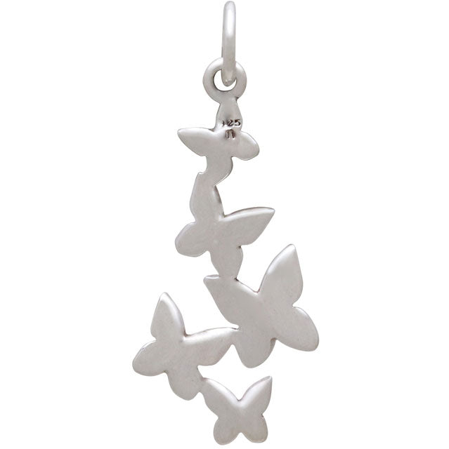 This sterling silver butterfly cluster pendant necklace has a three-dimensional quality, with graceful wings in mid-flight. Butterflies symbolize transformation, rebirth, and cycles. Our identities undergo endless changes. Butterfly shows us that saying good bye to one identity to make room for a new one can be beautiful and free.  This sterling silver pendant is paired with a sterling silver chain.