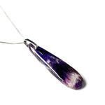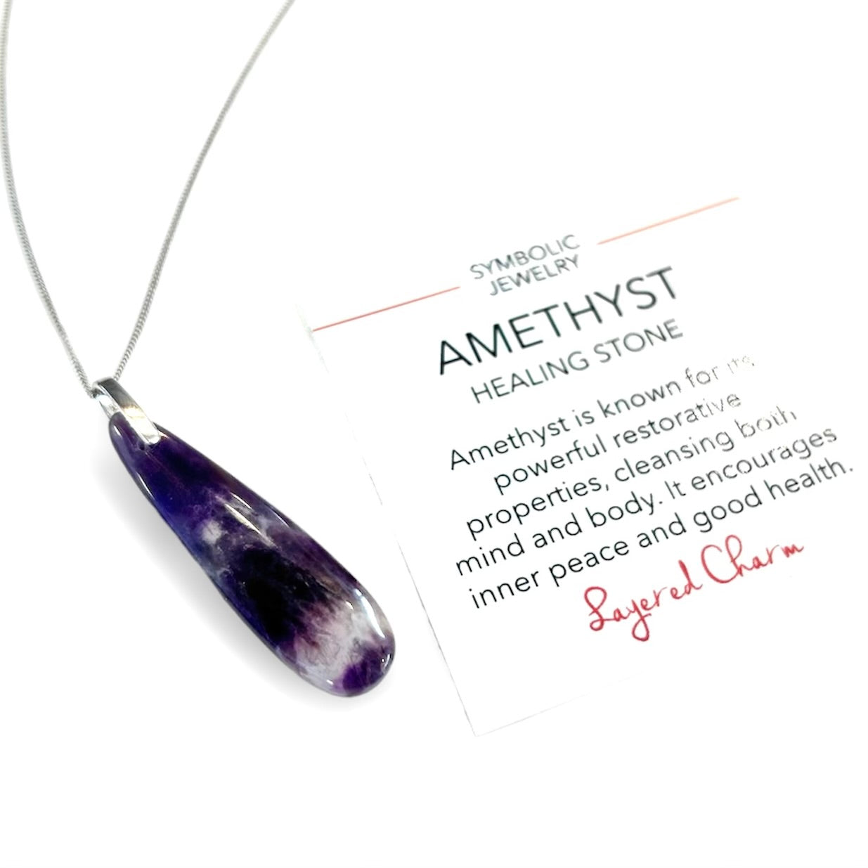 Elevate your elegance with our exquisite Dog Teeth Amethyst Drop Pendant Necklace. Featuring a stunning 12x45mm Dog Teeth Amethyst, this pendant showcases the natural beauty and unique patterns of the gemstone, making each piece truly one-of-a-kind. The elongated drop shape of the amethyst highlights its captivating banding and deep purple hues, reminiscent of the finest artistry found in nature.