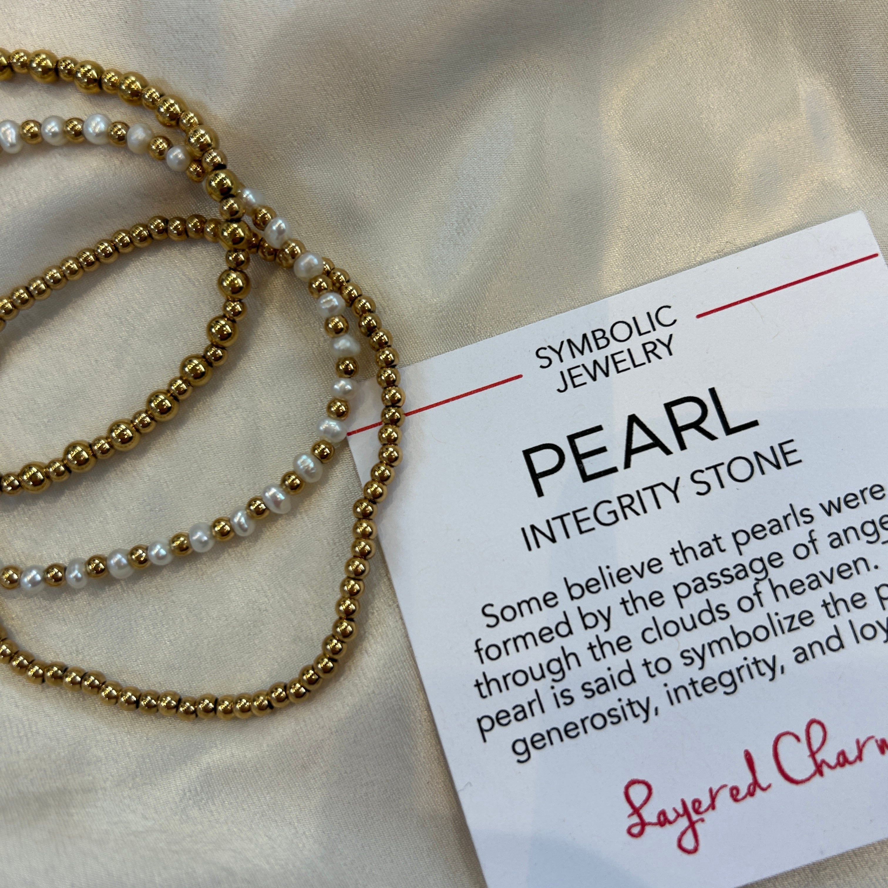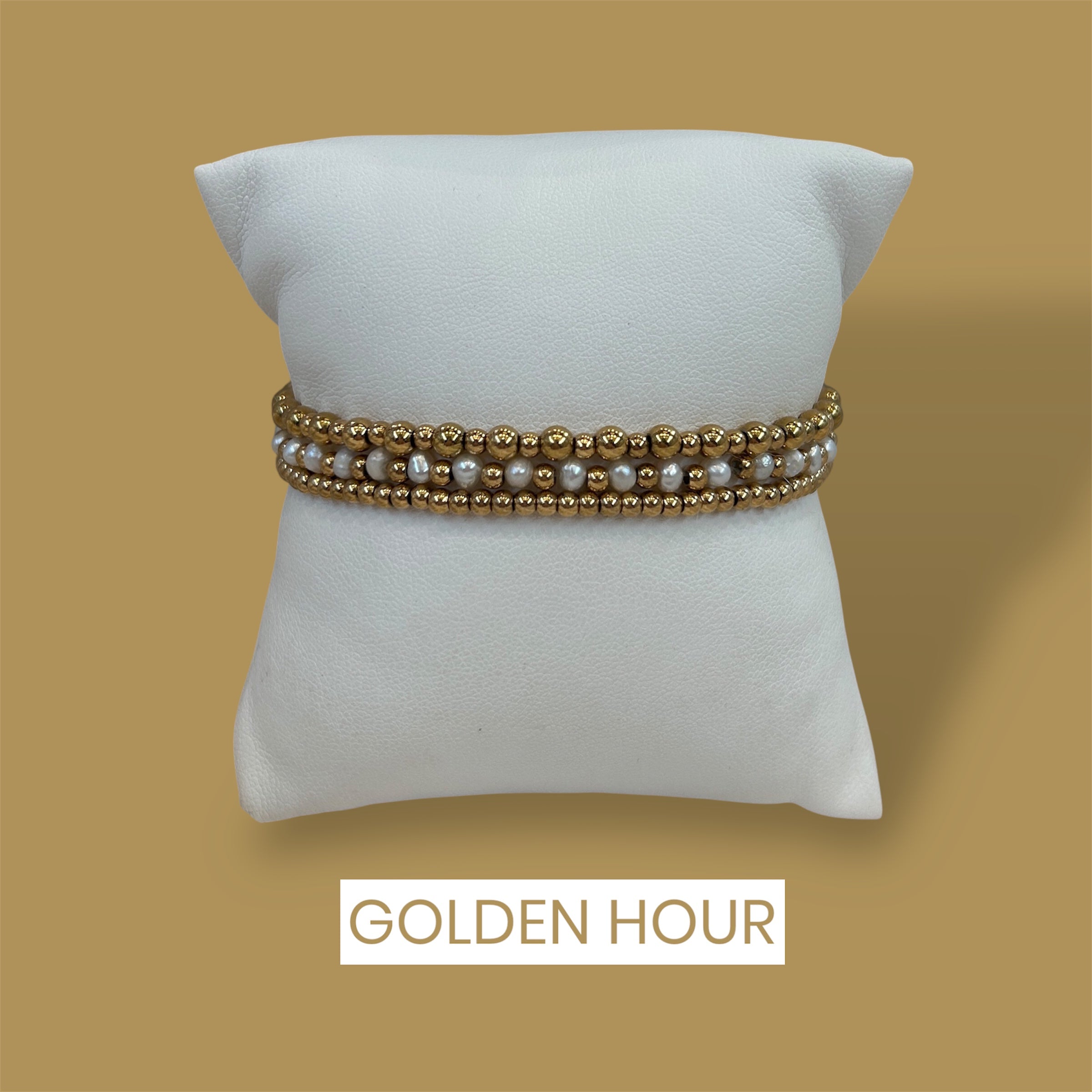 Glow with timeless elegance in the Golden Hour bracelet collection—a radiant trio of gold and pearl designed to capture the warmth of golden light. This three-piece set includes: