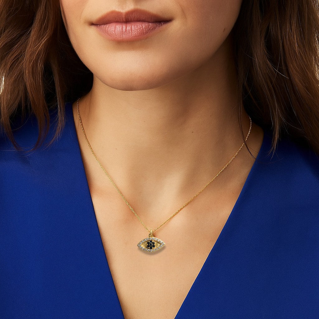 A symbol of protection, clarity, and strength — the Guardian Gaze Necklace serves as a radiant reminder that you are watched over and guided by light. This eye-shaped pendant sparkles with contrasting navy and white CZ stones, representing focus and purity, framed in either luminous 18K gold or rhodium-plated sterling silver.