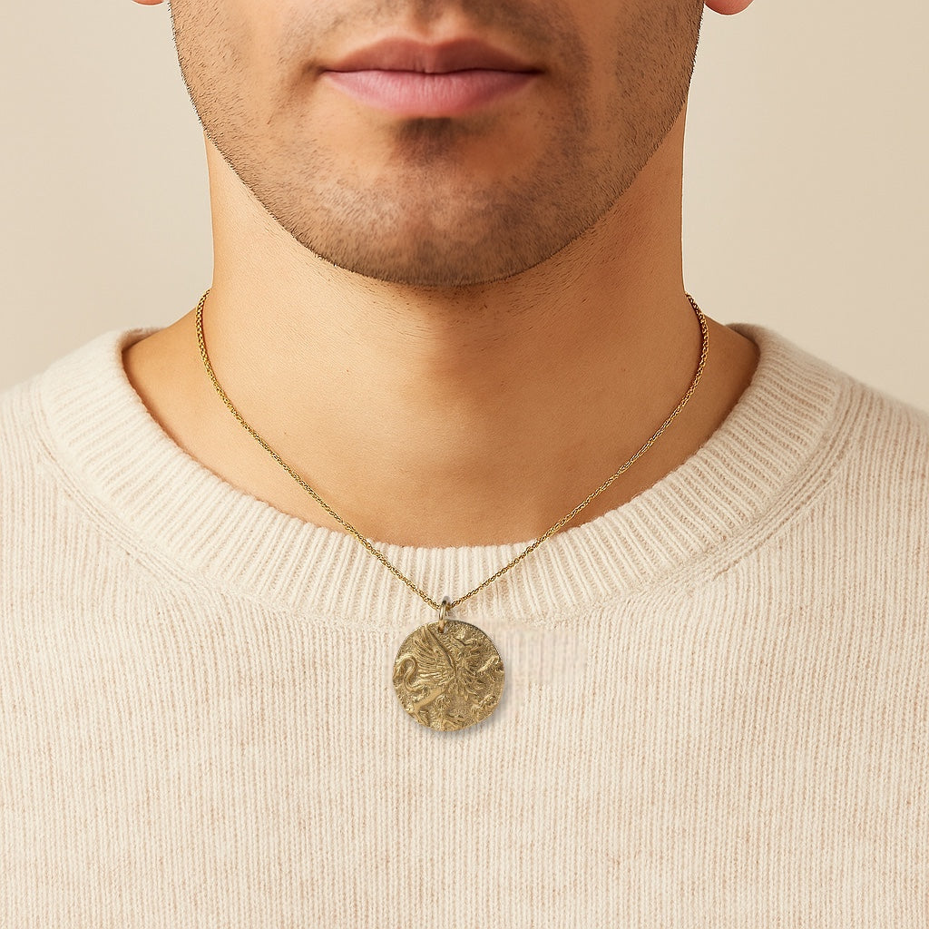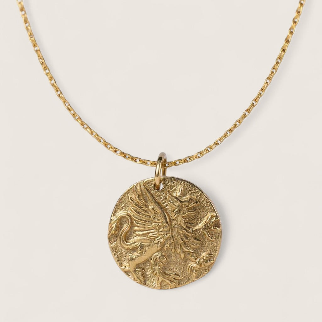 The griffin, a legendary creature with the strength of a lion and the vision of an eagle, has long been revered as a powerful guardian. This intricately cast bronze medallion depicts the griffin in dynamic detail, symbolizing protection, courage, and steadfast loyalty. Measuring 24mm tall by 20mm wide, the pendant is paired with an 18K gold-plated sterling silver chain for an elegant finish. Cast and hand-finished in Thailand, each piece carries both the artistry of ancient myth and the craftsmanship of skilled hands — a talisman to keep close as you guard the treasures of your life.