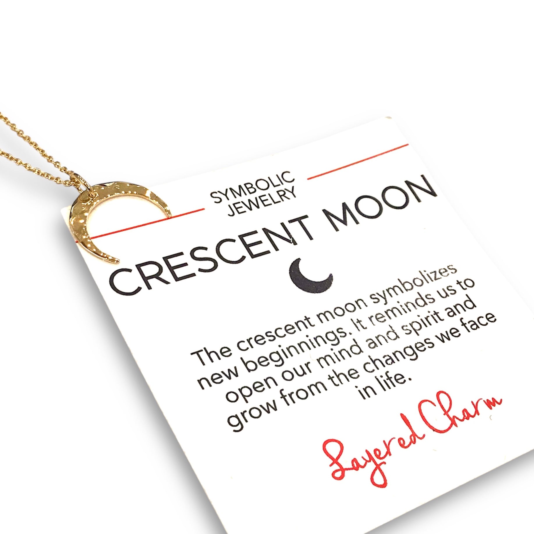 This beautiful piece of jewelry is crafted with 24 karat gold on sterling silver with a hammered crescent moon design and a jump ring in the center. The crescent moon symbolizes new beginnings. It reminds us to open our mind and spirit and grow from the changes we face in life.