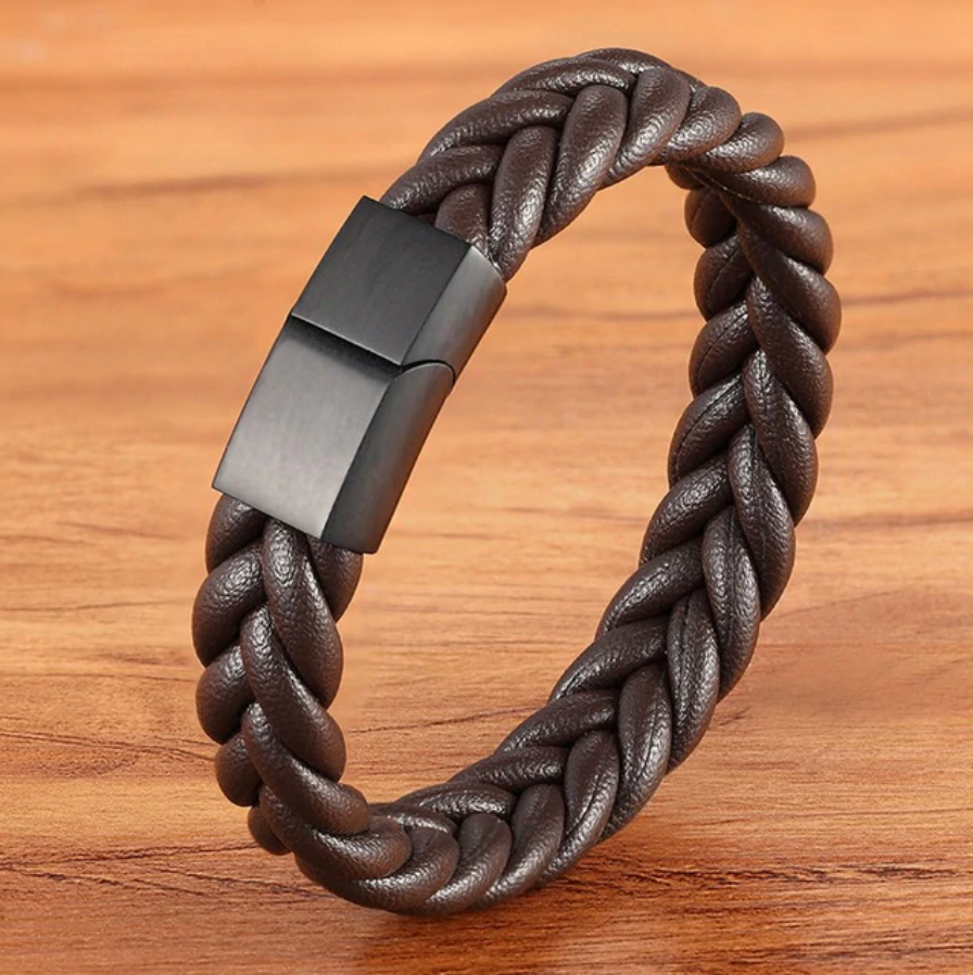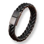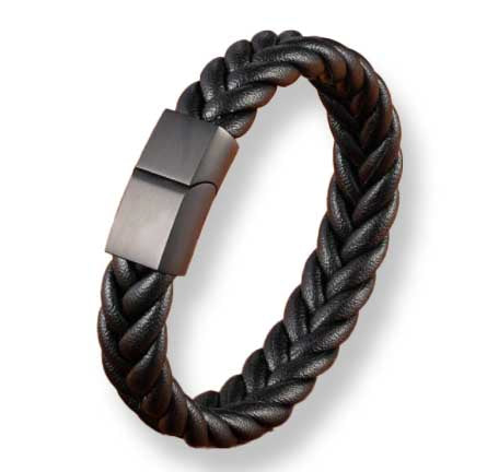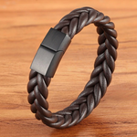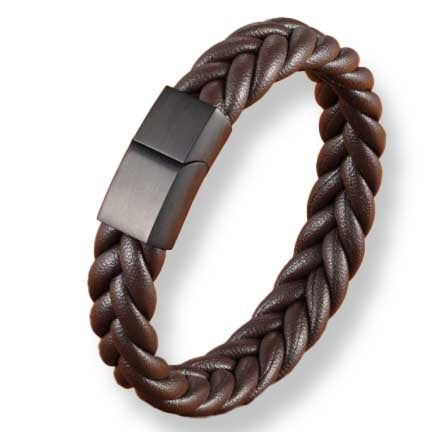 Premium leather men's bracelet featuring rope interwoven wide leather braid with a black clasp.  The clasp is strong and easy to put on or take off with a slide and magnet to hold in place.