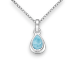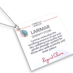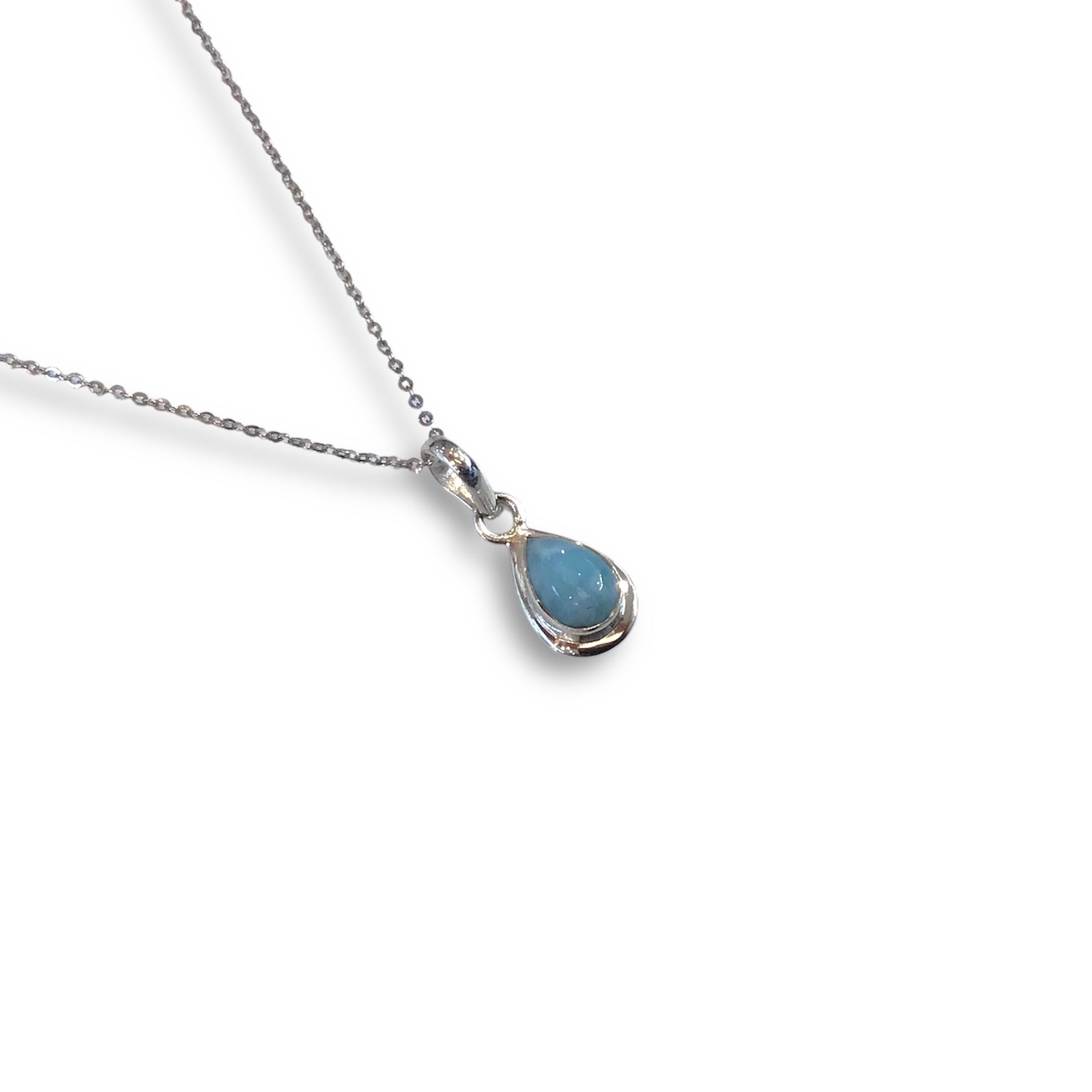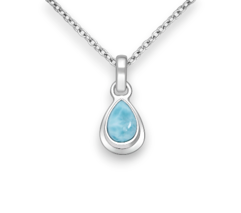 This elegant Larimar teardrop pendant captures the soothing essence of the sea and sky, with its stunning iridescent blue hues that evoke tranquility and peace. Set in sterling silver, the pendant measures 19mm tall by 9mm wide, offering a delicate yet striking presence.