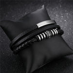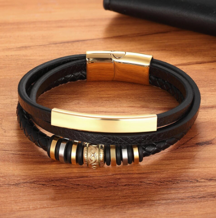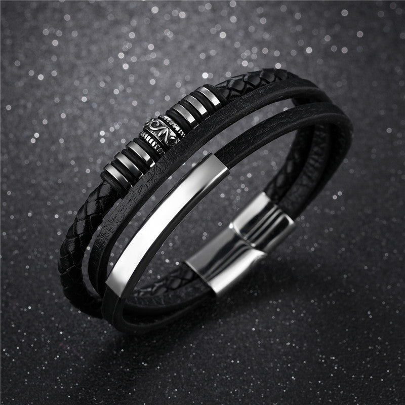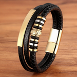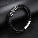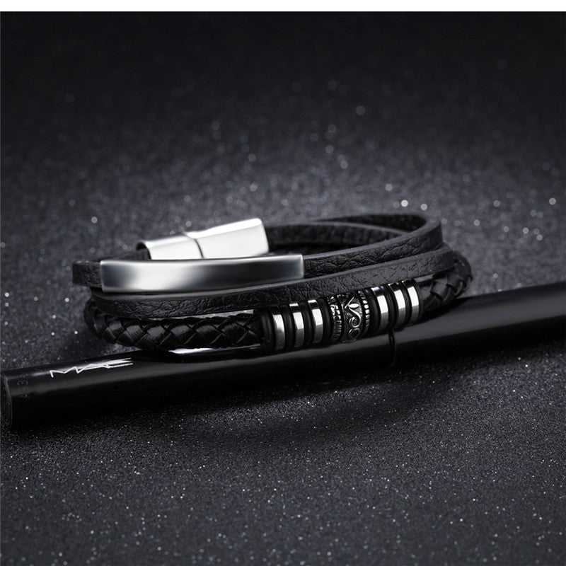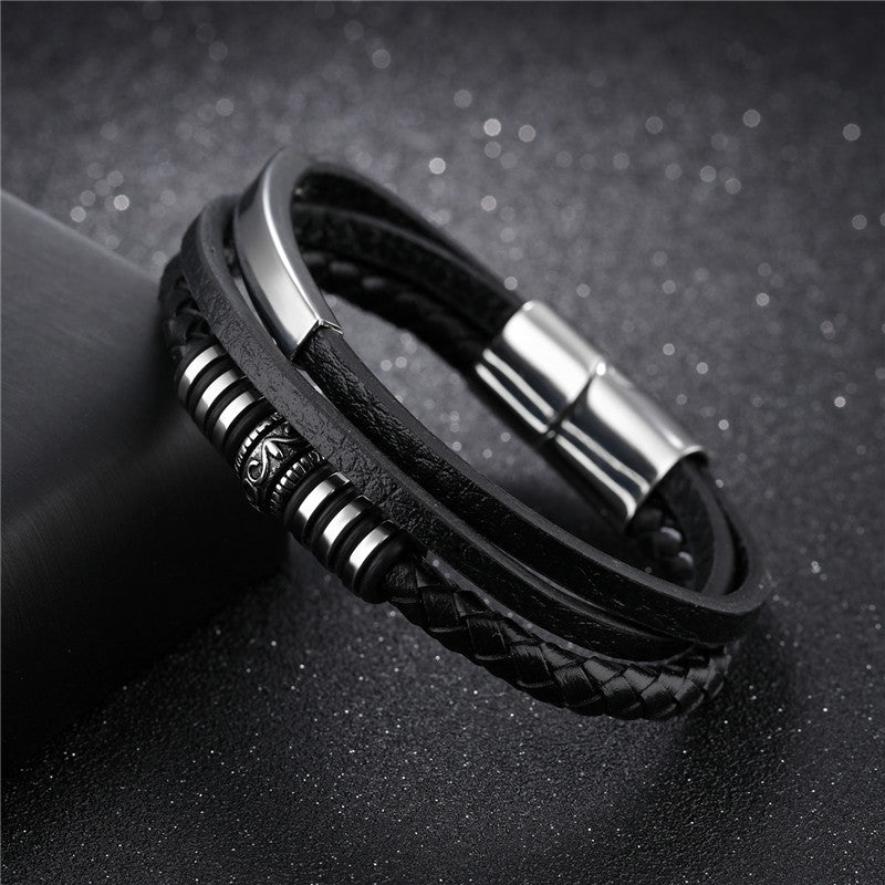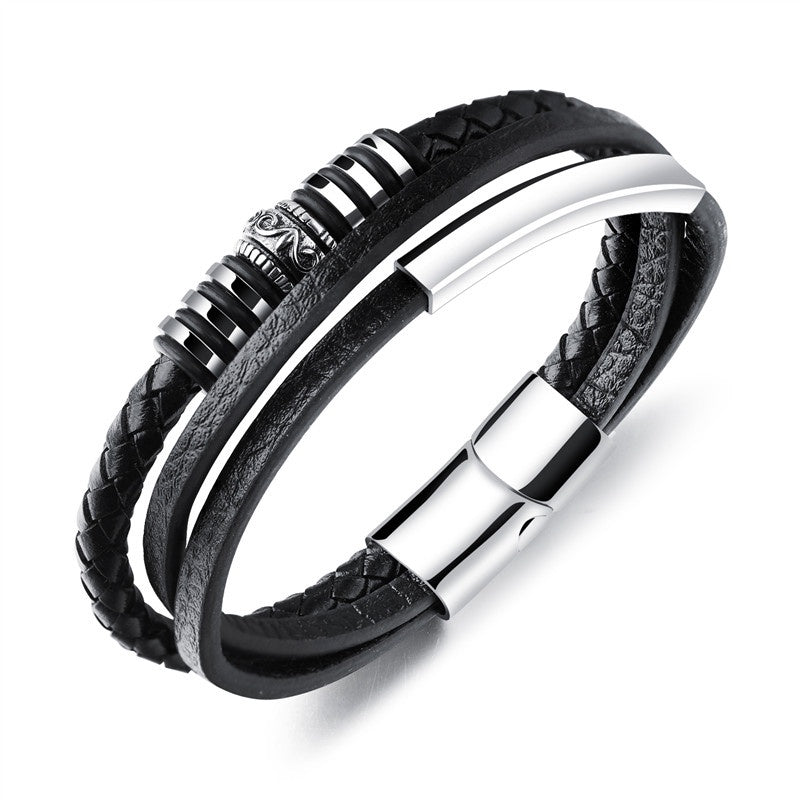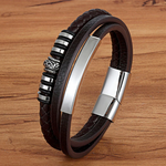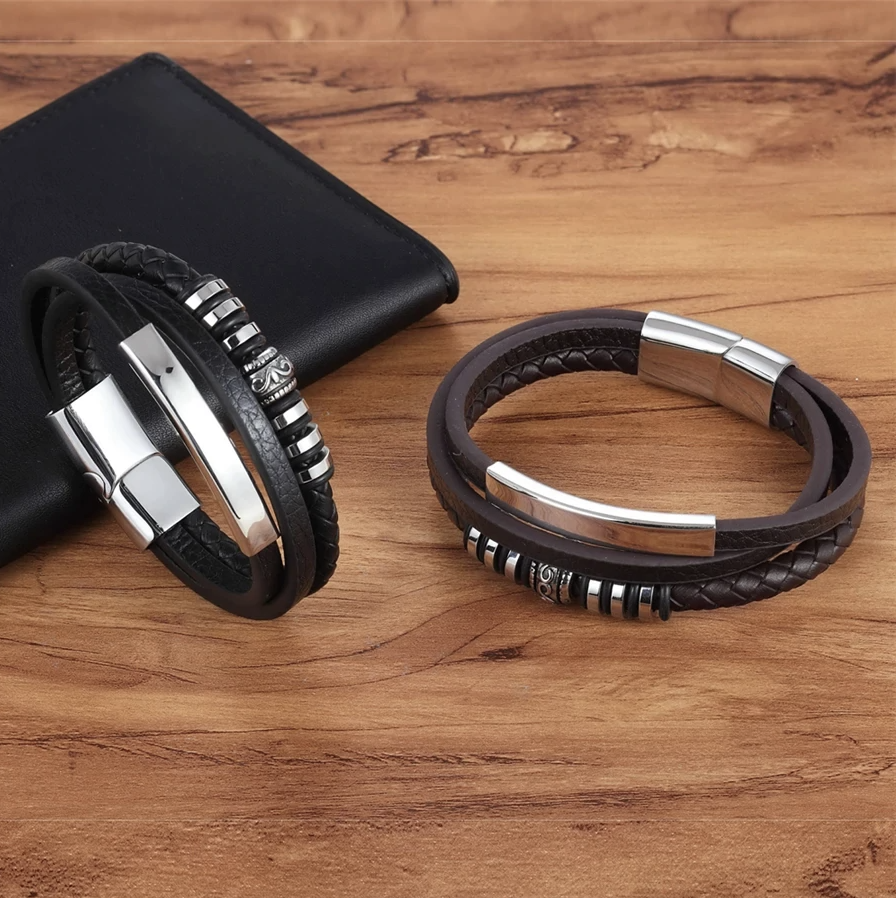 Premium leather multi-wrap men's bracelet featuring silicone and stainless steel pattern. The clasp is strong and easy to put on or take off with a slide and magnet to hold in place.