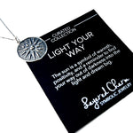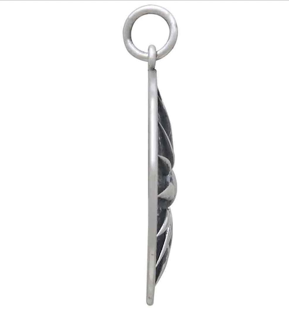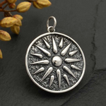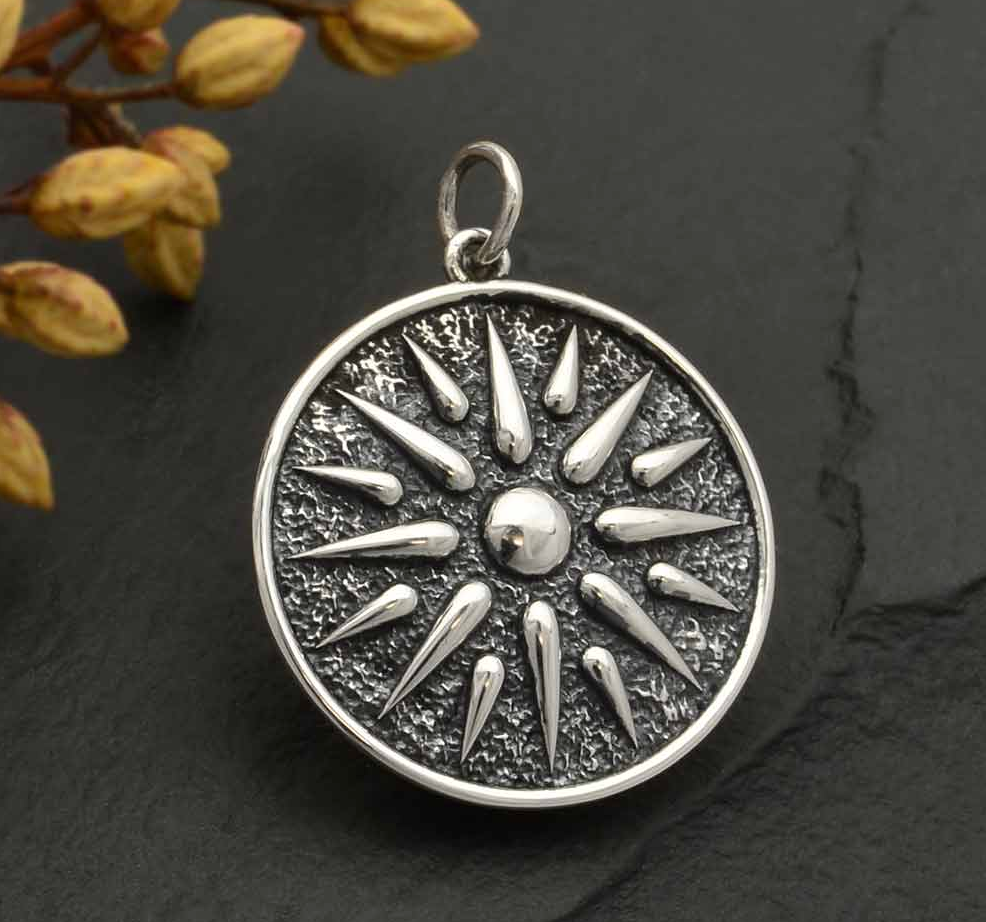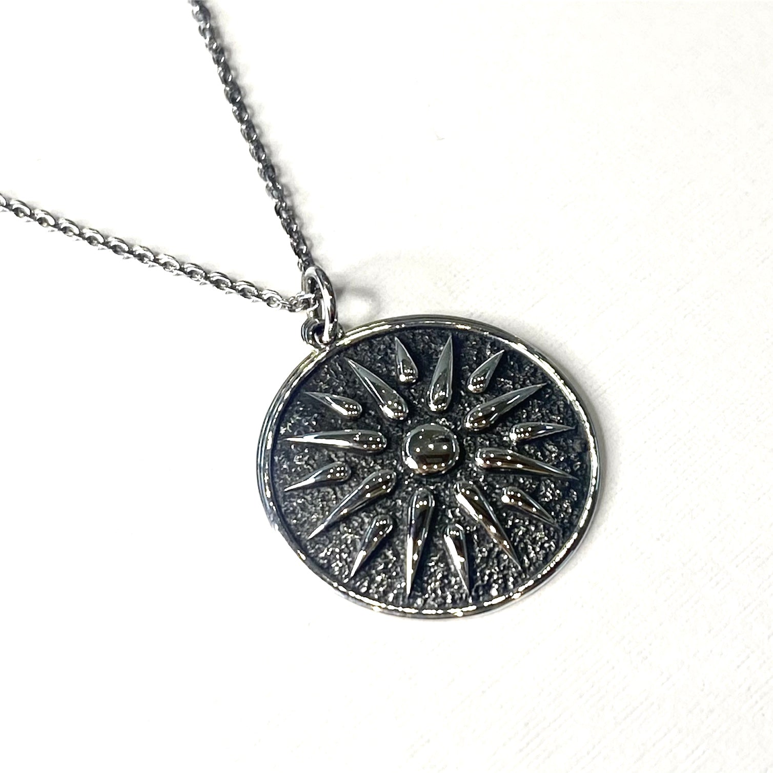 This beautifully crafted sun coin pendant measures 27mm tall by 21mm wide and is paired with a sterling silver chain.