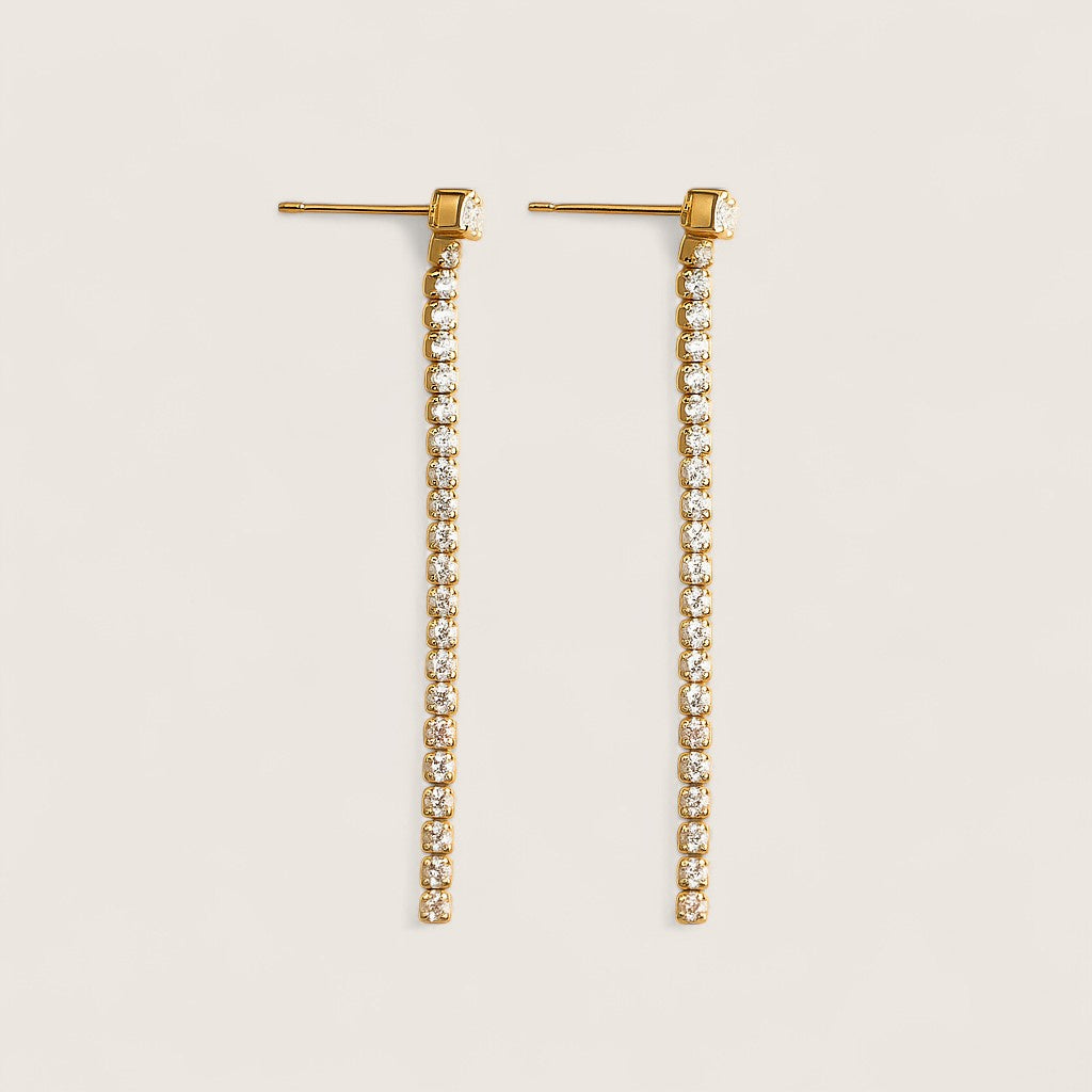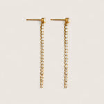 The Luminous Cascade Earrings bring effortless elegance with their sleek, linear silhouette. Crafted in stainless steel and set with a shimmering row of cubic zirconia, these drop earrings catch the light with every movement for a refined, radiant look.