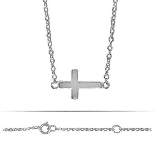 Rhodium Plated on Sterling Silver, sideways Cross charm necklace with oval link, spring clasp and 1 inch extension. Approx charm size: 18mm L x 11mm W.