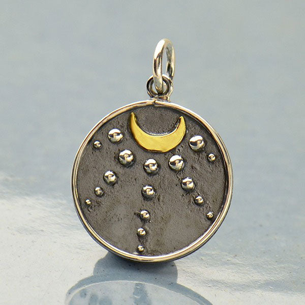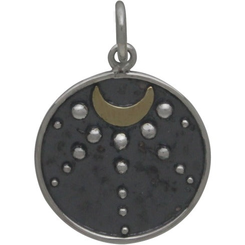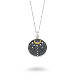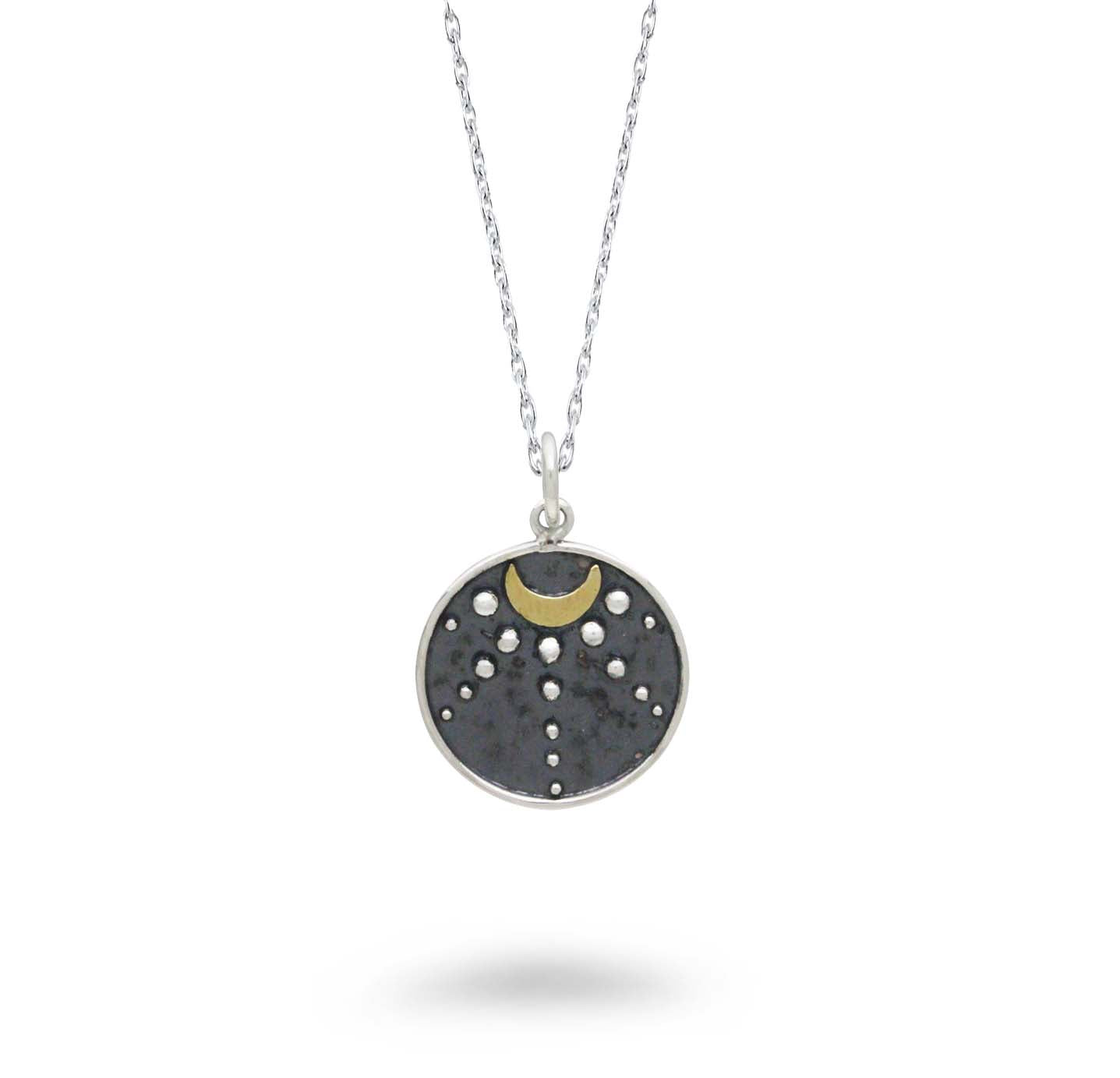 Sterling Silver Talisman pendant necklace with Moon and Granulation. This handmade, Mixed Metal Celestial Pendant features Black Oxidation to create the night sky as a beautiful backdrop for the Sterling Silver Granulated Dots representing Moonbeams and the Bronze Crescent Moon. The word "crescent" comes from the Latin word "crescere," meaning to grow. The crescent moon symbolizes new beginnings. It reminds us to open our mind and spirit and enjoy the changes we face in life. Find a jewelry piece that makes a perfect gift or reminder of our journey to attain our goals. Each crescent moon jewelry piece comes with a meaningful cardstock included with jewelry packaging.