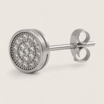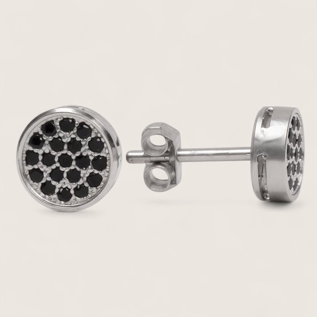 Bold and precise, the Eclipse Studs feature a 6mm round outer frame crafted in rhodium-plated sterling silver. These polished post-back earrings are set with a micro pavé of cubic zirconia stones, available in icy clear or deep black for a refined yet modern edge. Hypoallergenic and timeless—built to elevate everyday style.