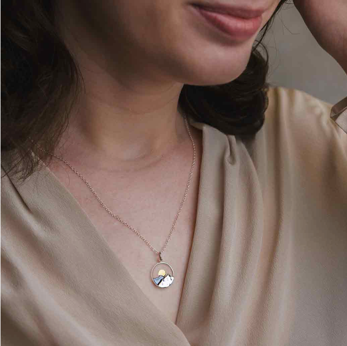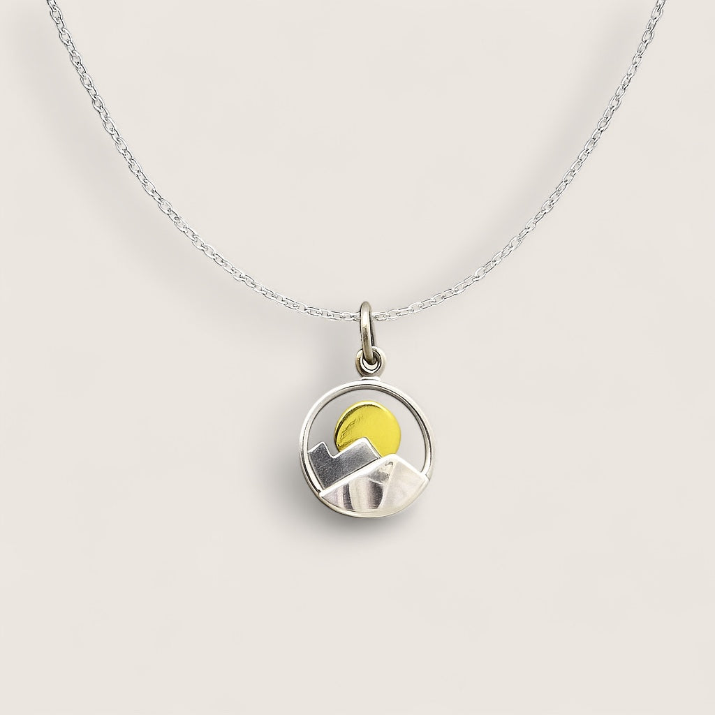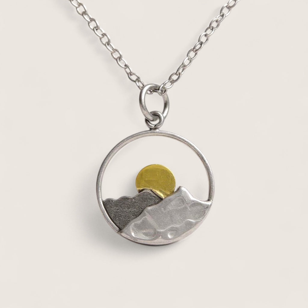 Celebrate the beauty of nature with the Golden Summit necklace, hand-finished in sterling silver and bronze. This striking pendant captures a golden bronze sun rising or setting over rugged sterling silver mountains, framed in a perfect circle. Available in two sizes — small (16x10mm) for a subtle touch or medium (18x15mm) for a bolder statement — each piece is paired with an 18" sterling silver chain. A wearable reminder of adventure, resilience, and the call of the wild.