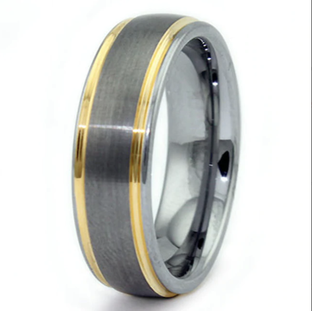 This tungsten ring features a brushed flat center with gold-plated inlay and sides of the ring. Tungsten rings are known for their hardness they don't scratch like silver or gold rings making them one of the most durable low-maintenance ring options on the market. This ring is either 4mm or 5mm wide and has a comfort-fit inner radius for a more comfortable fit.