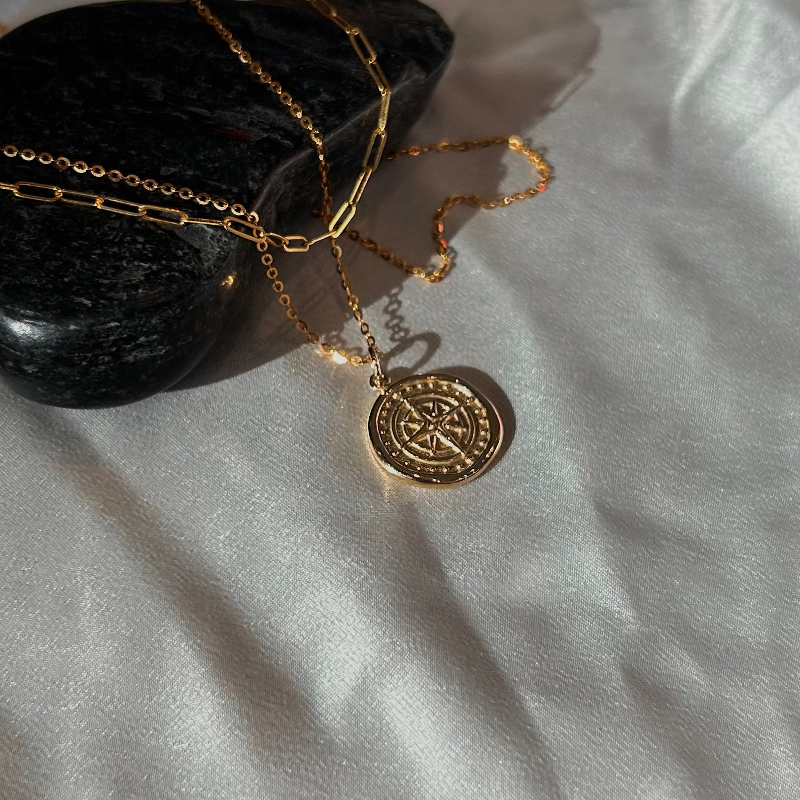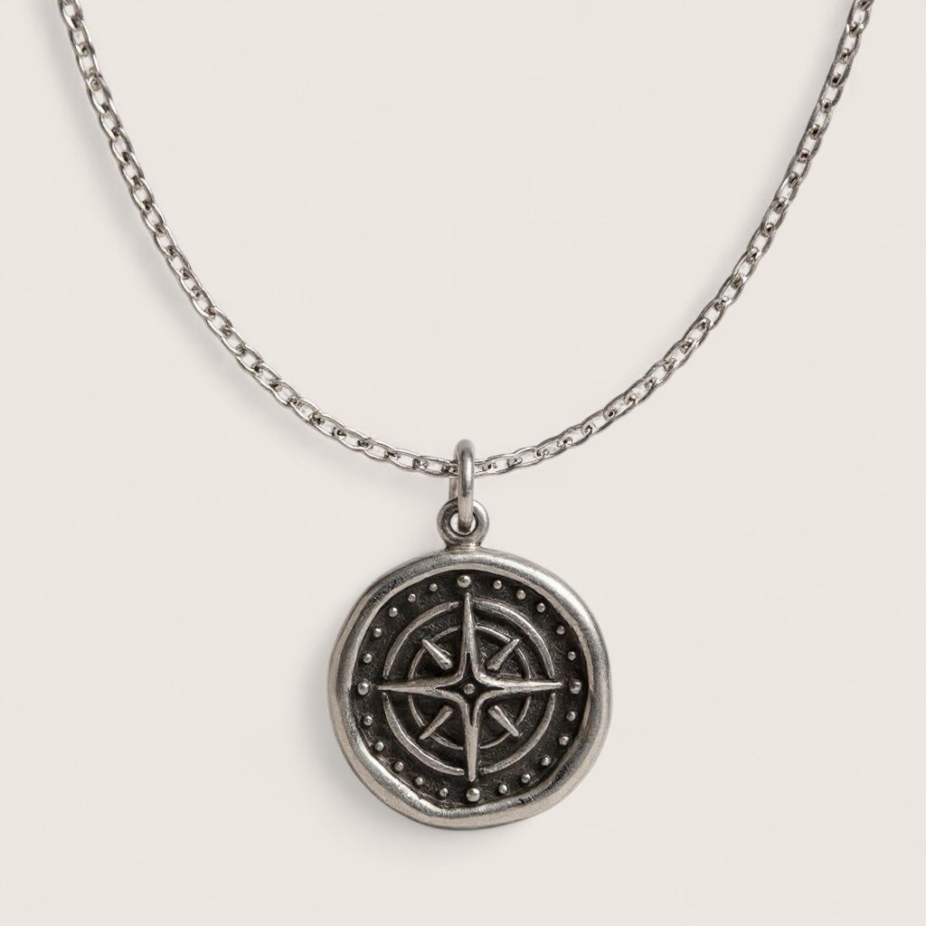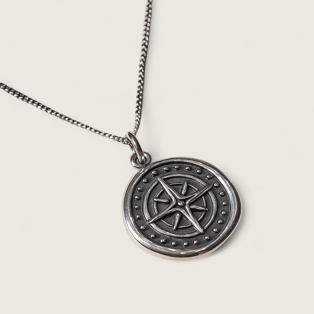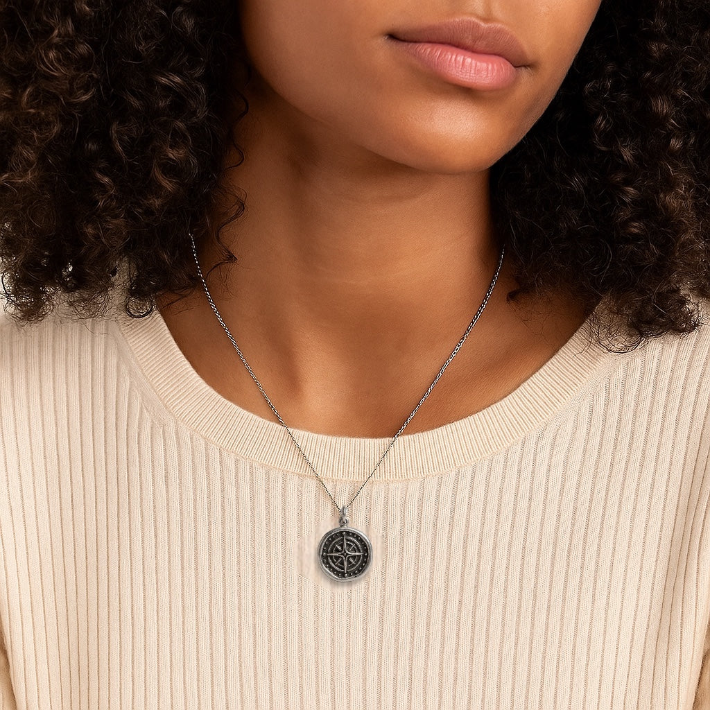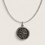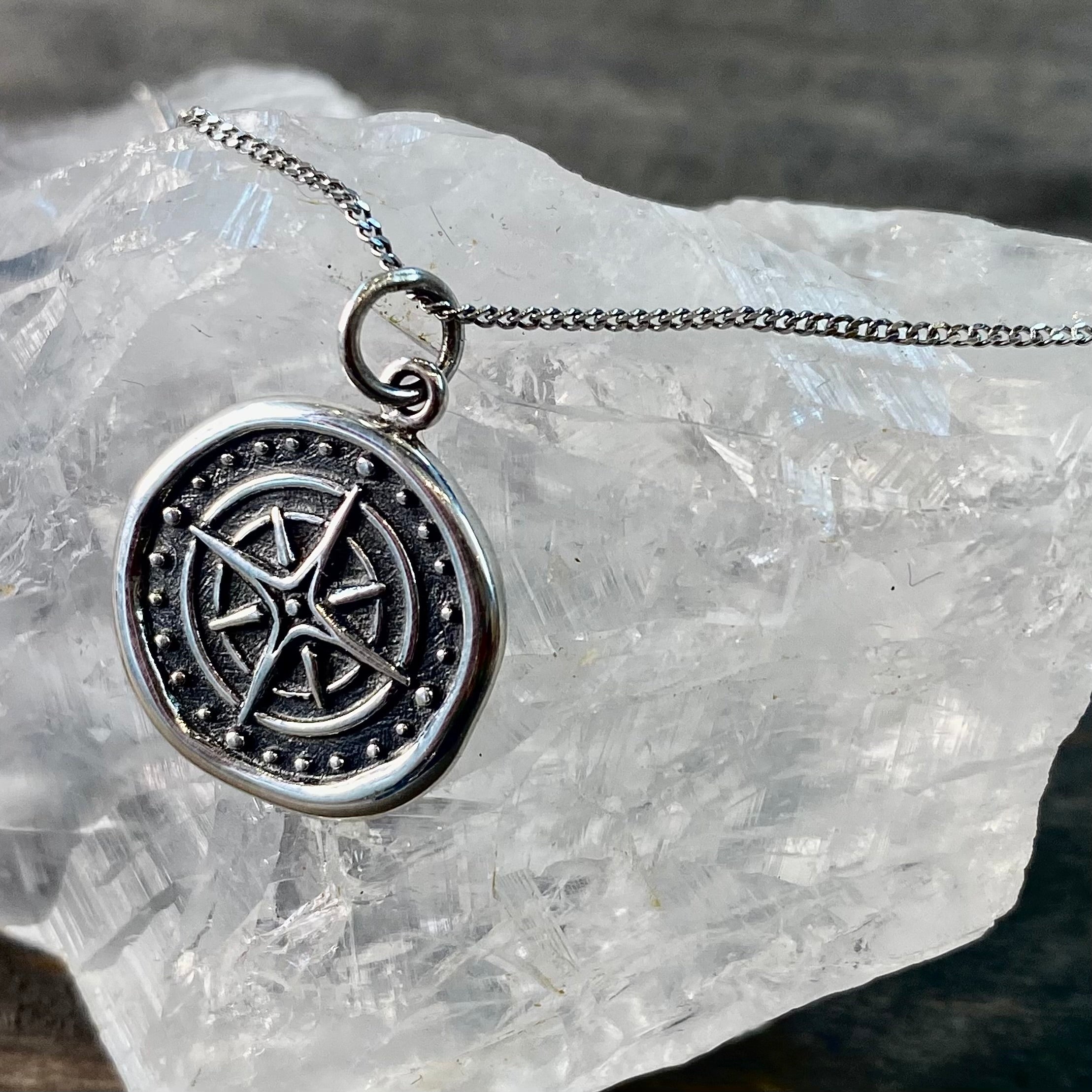 Enjoy this sterling silver wax seal compass necklace. Let this necklace serve as a reminder of your destiny. The compass is a symbol of the adventures in life and knowing your true north. It is a guide to conquering your destiny.