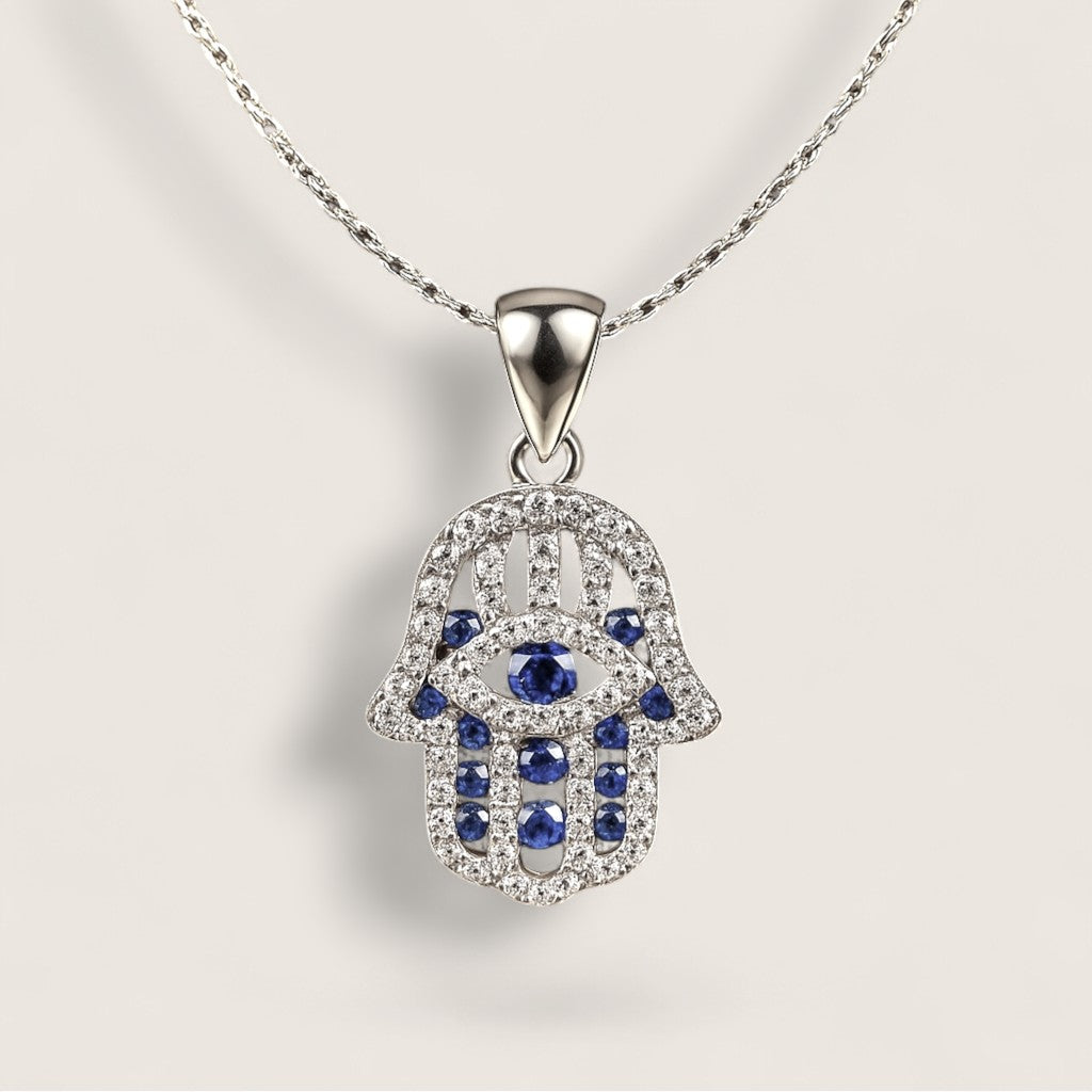 Carry a timeless symbol of protection with the Guardian Hamsa Necklace. This sterling silver pendant, finished in rhodium, measures 15x12mm and shines with a blend of clear and deep blue cubic zirconia. The Hamsa hand, paired with the central eye motif, is believed to bring its wearer protection, happiness, and good fortune. Suspended from an 18" sterling silver chain, it’s a meaningful piece for both everyday wear and gifting.