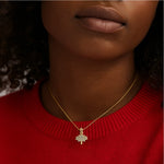 The pendant is adorned with sparkling cubic zirconia stones, adding a touch of brilliance to its timeless design. Paired with a sterling silver necklace featuring a secure spring clasp, this piece is perfect for adding a subtle yet striking accent to any outfit.